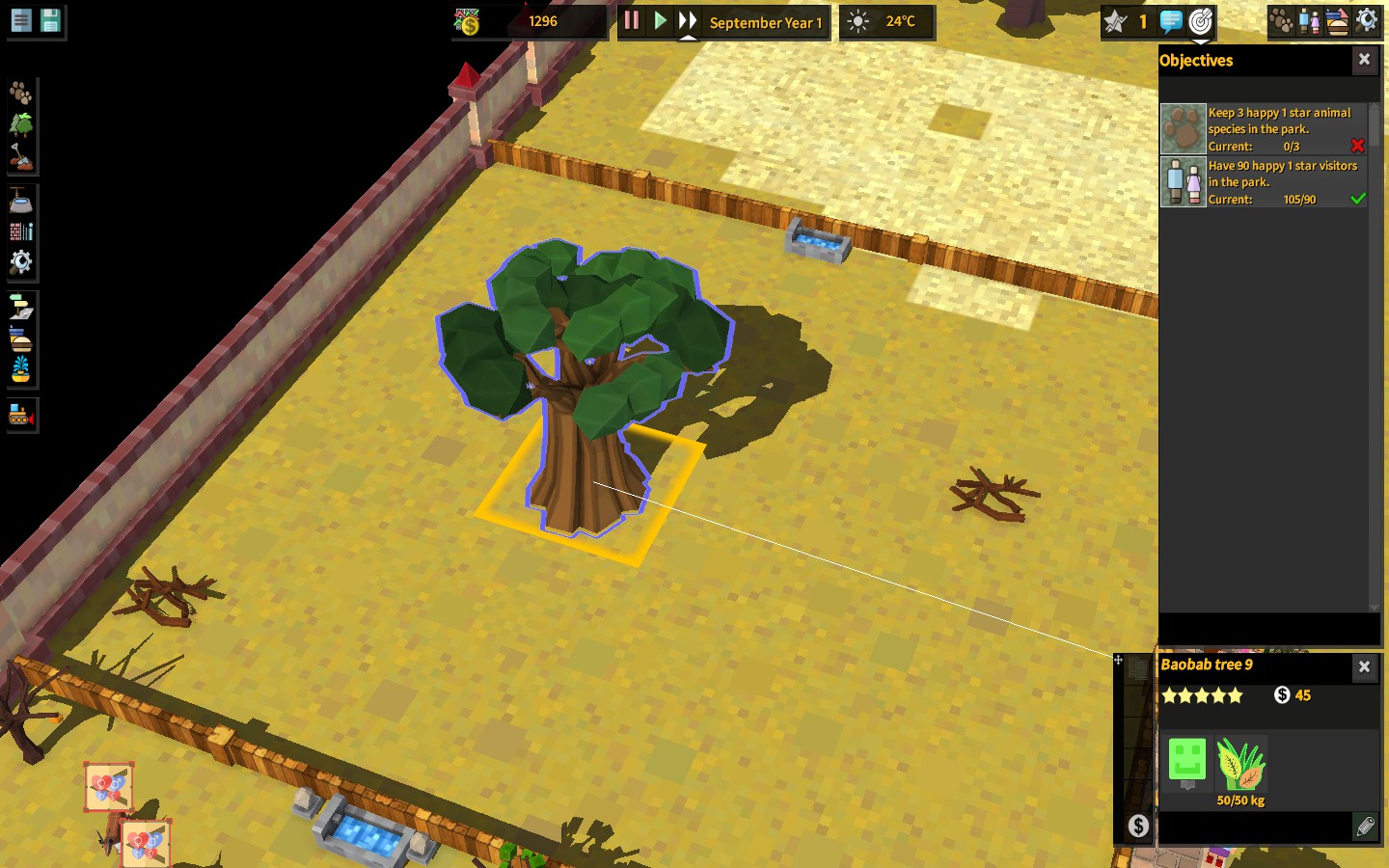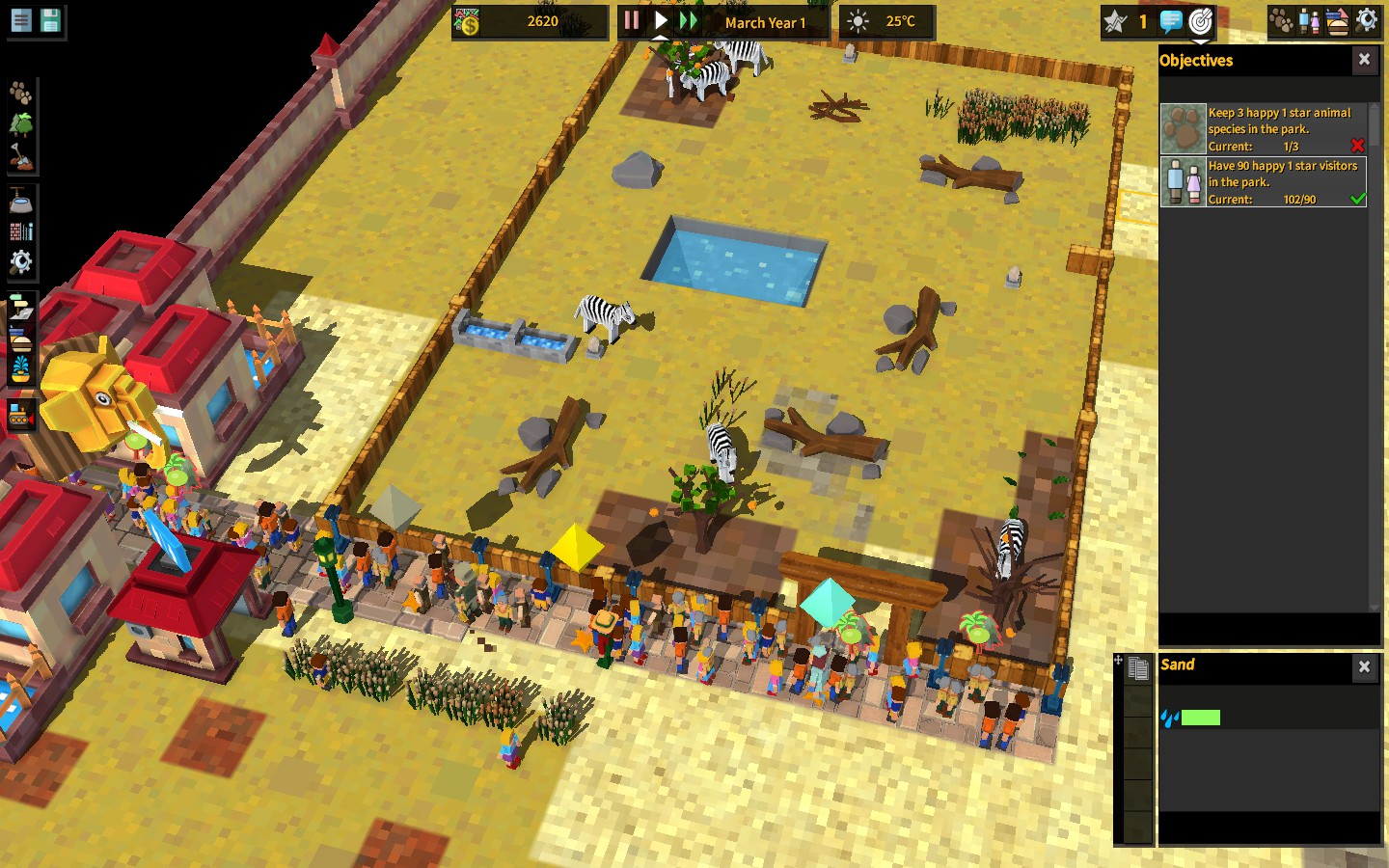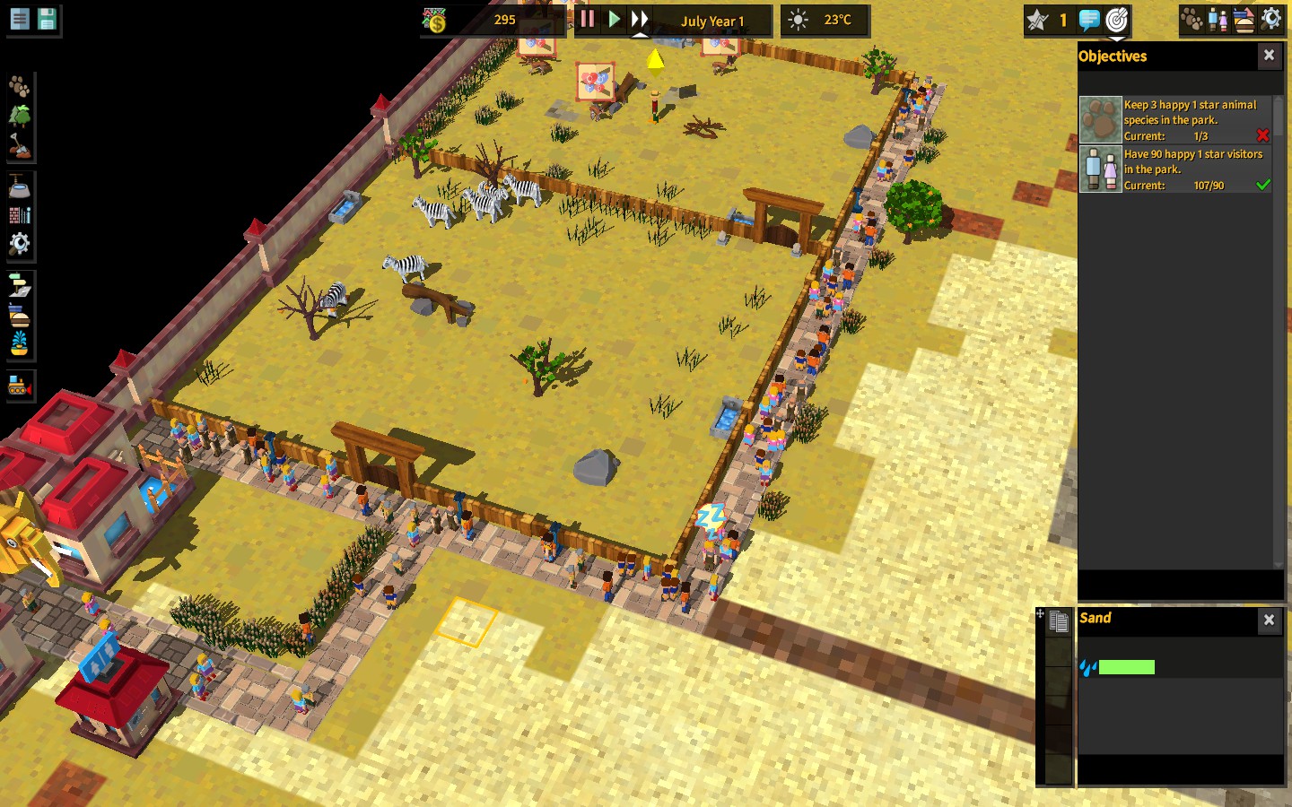 В раннем доступе версии 1.00 можно поиграть только в песочницу, и на старте игры она предлагает 2 цели: иметь 90 счастливых посетителей и 3 счастливых популяции разных видов животных. При выполнении этих целей парк поднимается с уровня однозвёздочного до уровня двухзвёздочного, что открывает новые объекты и новых животных.