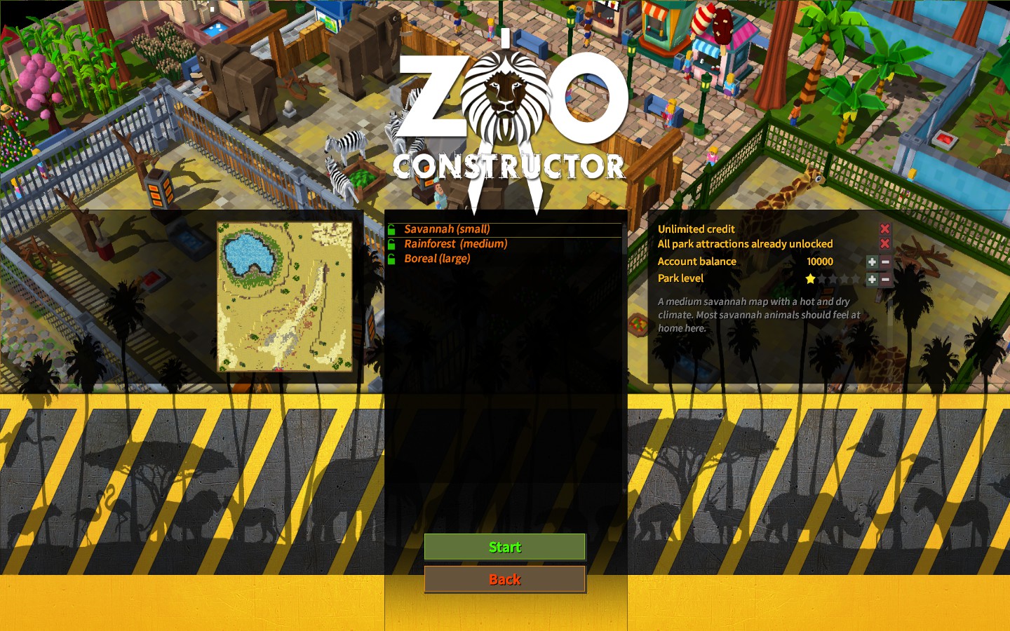После нажатия кнопки Start игрока закидывает на пустую карту, где имеется лишь вход в зоопарк и кусок дороги. Так и начинается строительство зоопарка. Карта, кстати, внушительных размеров, так что в перспективе получится построить довольно масштабный зоопарк.