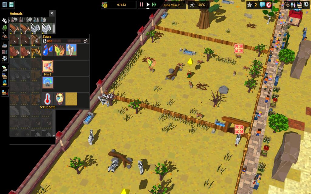 Главная особенность игры – это то, что каждый вид животного здесь имеет уникальные потребности и предпочитаемую экосистему. Экосистема в Zoo Constructor представлена типом земли, растениями, которые могут расти на таком типе земли и температурой.