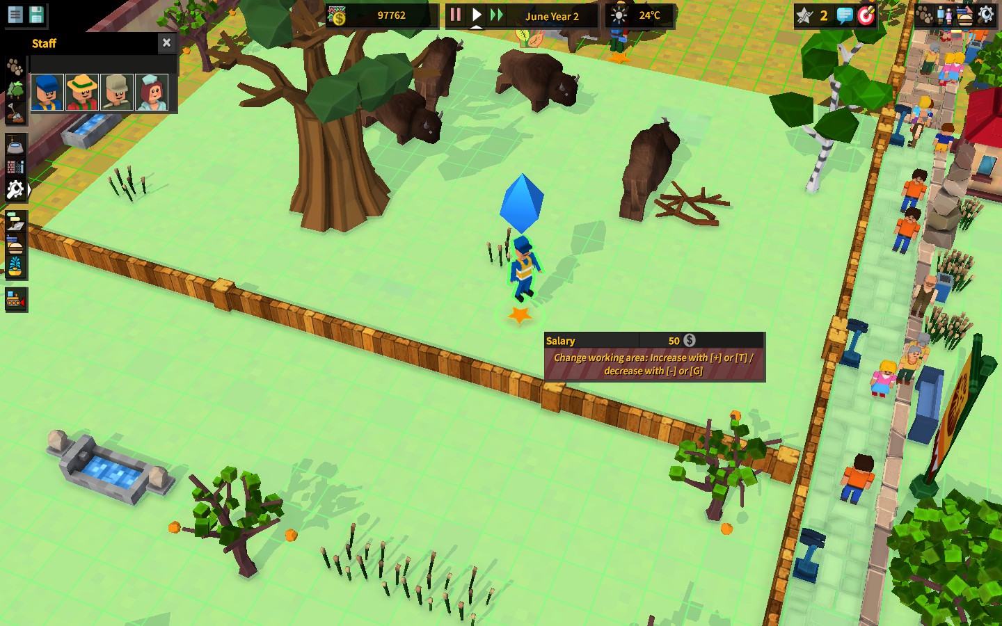 Персонал здесь не умеет ходить по парку и не имеет собственных нужд. Каждый ваш работник будет просто как бездушный робот обитать в пределах зелёной зоны действия и выполнять свою работу. Данная система выглядит достаточно уныло, и это то, что следовало бы развить за время нахождения Zoo Constuctor в раннем доступе.