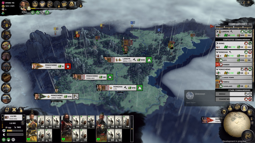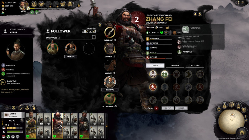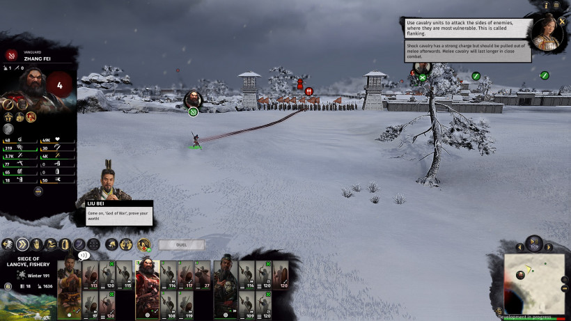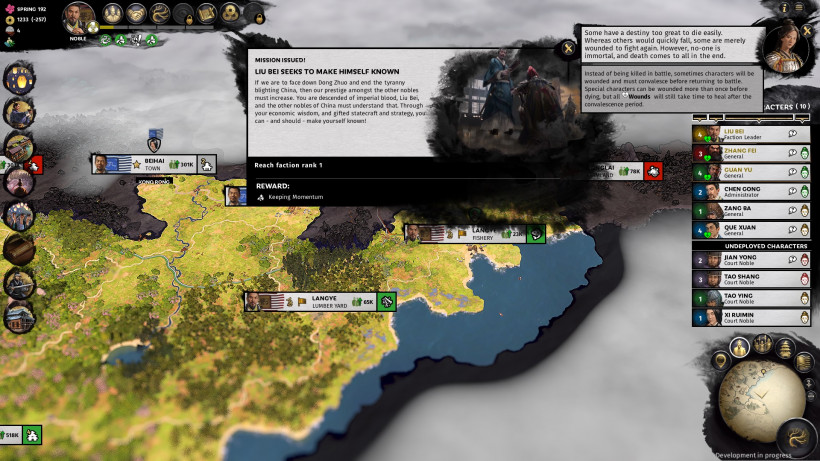К несчастью, нам не удалось поучаствовать во многих сражениях лично. Одна из способностей Ли Бея – возможность аннексировать территорию Хань вместо того, чтобы взять эти земли силой. Эта особенность помогла нам избежать пары крупных осад в игре. Начиная игру полностью окружённым землями Хань, вполне логично, что проще ее «выкупить», вместо того, чтобы вести завоевательную кампанию. Лю Бей использует уникальный фракционный ресурс Единство для аннексии, который можно получить благодаря разным трейтам и делам. Чем больше Ли Бей аккумулирует Единства, тем быстрее он пробивает себе дорогу по древу фракции (в том числе и открывает новые бонусы). Таким образом, он может довольно быстро пробиться к верхушке своей фракции, если правильно расставить приоритеты игры.