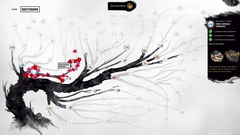 Экран исследований (или реформы, как они названы в игре) очень стилизован – он следует заветам предков и представляет из себя разветвленное древо, которое медленно распускается по мере достижения прогресса. Реформы проходят каждую весну, таким образом, нет каких-то видимых элементов развития научно-ориентированной экономики.