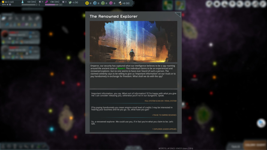 Так, например, у нас есть случайные события. Часто событие будет появляться после колонизации планеты. События могут выпадать после полного изучения сектора. Будут даже такие, которые можно рассматривать как «гром среди ясного неба» – так называемые Галактические события, появляющиеся время от времени. Вы не можете предсказать время их появления, хотя во время колонизации вы будете ожидать одно из них, но вы будете твёрдо уверены в исходе таких событий. Так что ситуации, когда все доступные варианты выбора в событии приводят к плохим или очень плохим исходам (а события созданы так, чтобы всегда предоставлять варианты), будут довольно редки. Изредка перед вами будут вставать дилеммы, но всегда будет способ получить что-то от события, даже если это будет стоить чего-то другого. Так что у вас всегда есть выбор. Следовательно, мы сделали сознательный выбор не создавать случайные события, которые не дают игроку какого-либо выбора, и именно это мы имели в виду под «случайностью, которая частично находится под контролем игрока».