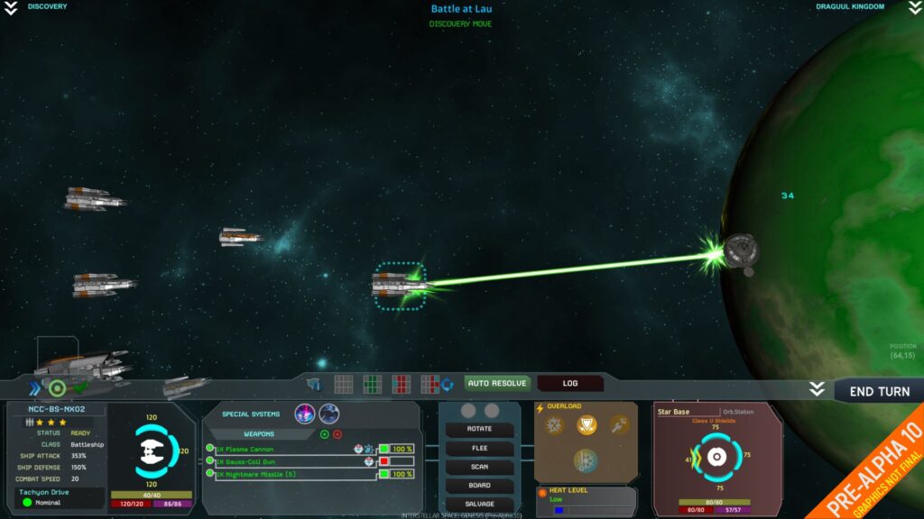 Как уже было сказано, Interstellar Space: Genesis взяла модель сражений из MoO2 и добавила к ней новый тип мегаорудий. Мы разделили вооружение на три отдельные категории – кинетическое, лучевое и ракетное (включая торпедное). Также существует механика энергетической перегрузки, позволяющей перегрузить орудия, двигатели или щиты для бонуса в этой конкретной системе, а ещё у кораблей 3D модели. Плюс ко всему, реализована новая механика сбора трофеев, которая позволяет получить кредиты, технологии и даже захватить лидера с обломков уничтоженных кораблей. К тому же, мы всячески пытаемся сделать космические сражения привлекательными в плане графики и звука.