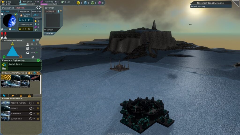 Впрочем, главная движущая сила вашей империи – это колонии, так что основная часть управления империей происходит в них. Именно в колониях вы строите корабли и развиваете большую часть своей экономики (внеколониальные факторы – это туризм и добыча ресурсов). Вы можете специализировать инфраструктуру ваших колоний под планетарную инженерию (улучшение или трансформирование биома планеты для увеличения роста населения и морали); под более быстрое строительство; под более дешёвое содержание и наличие большего числа доступных зданий для постройки; под более быстрое строительство кораблей или производство более опытных кораблей, чтобы снабжать ими целую империю. Таким образом, вы выбираете, как специализировать инфраструктуру ваших колоний, и затем решаете, куда распределить ваше производство – на постройку зданий, кораблей, улучшение окружающей среды или на продолжение развития инфраструктуры.
