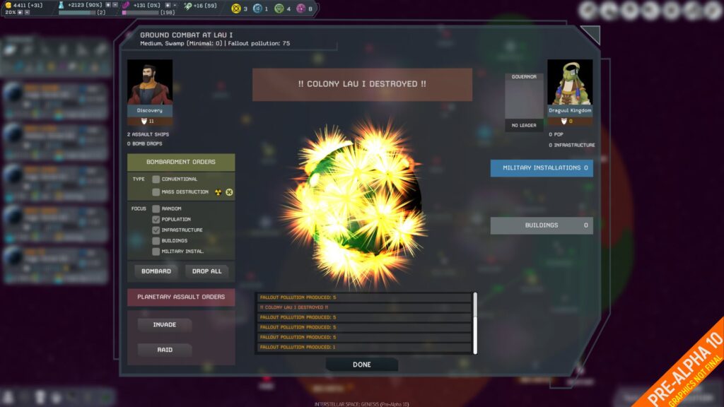 Так что, в некоторых случаях игрок может выбрать более общепринятую и сфокусированную бомбардировку, для которой нужны бомбардировщики и соответствующие технологии, чтобы не нанести вред окружающей среде и сберечь строения и инфраструктуру, в то же время ослабляя защиту, уничтожая ПОПы (вы можете выбрать целью ПОПы, инфраструктуру, гражданские или военные строения). Или вообще не использовать бомбардировщики и напрямую вторгнуться большим числом войск. Или, возможно, игрок захочет осаждать систему, чтобы снизить уровень производства и ослабить защиту. Вы можете решить, использовать ли ядерное оружие для большего результата ценой вреда окружающей среде и уменьшения уровня производства на время, но также вы получите дипломатические штрафы за их использование. Если вы выберете ядерное оружие, то у вас будет возможность развить его дальше с помощью специальных технологий определённых стратегических ресурсов.