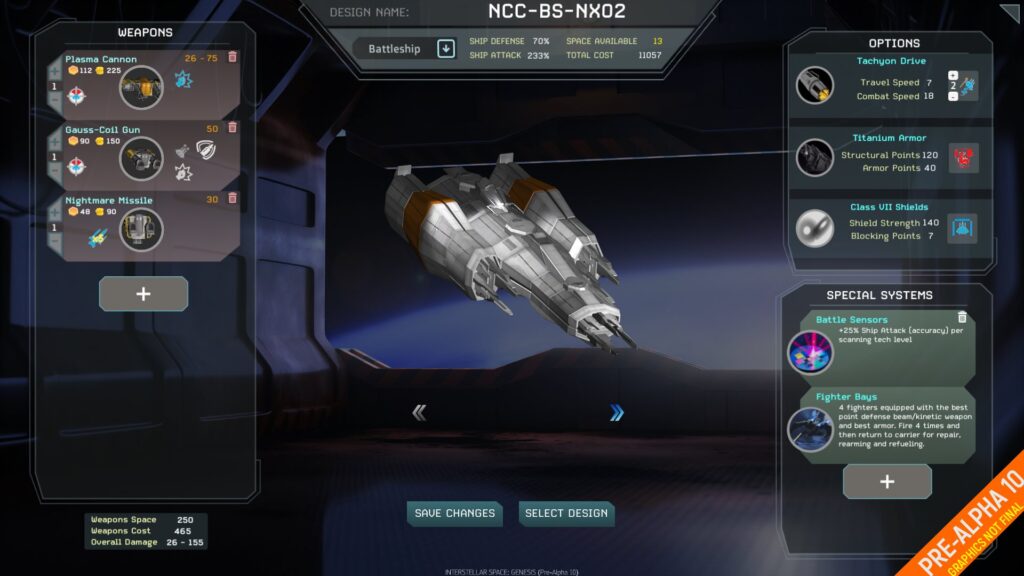 Кроме того, мы даём возможность игру создавать собственные корабли. Мы хотели сделать систему дизайна кораблей гибкой и глубокой, чтобы дать игроку место для воображения, но без требующую больших времязатрат или обязывающую работать с слишком большим количеством деталей. Так что, вы можете выбрать из нескольких корабельных модулей, или специальных систем, таких как отсек истребителей, притягивающие лучи и глушители и другие. Можно выбирать между кинетическим, лучевым и ракетным вооружением. Вы можете выбрать определённое количество любых специальных модификаций для оружия вроде способности пронизывания щитов и брони, нескольких выстрелов подряд, специализации против ракет и истребителей или тяжёлого крепления для дополнительного урона и дальности стрельбы. Также вы можете выбрать траекторию стрельбы для вашего оружия. Стоит сказать, что большинство орудий имеют свои особенности помимо нанесения урона, что поможет в выборе орудий для кораблей.