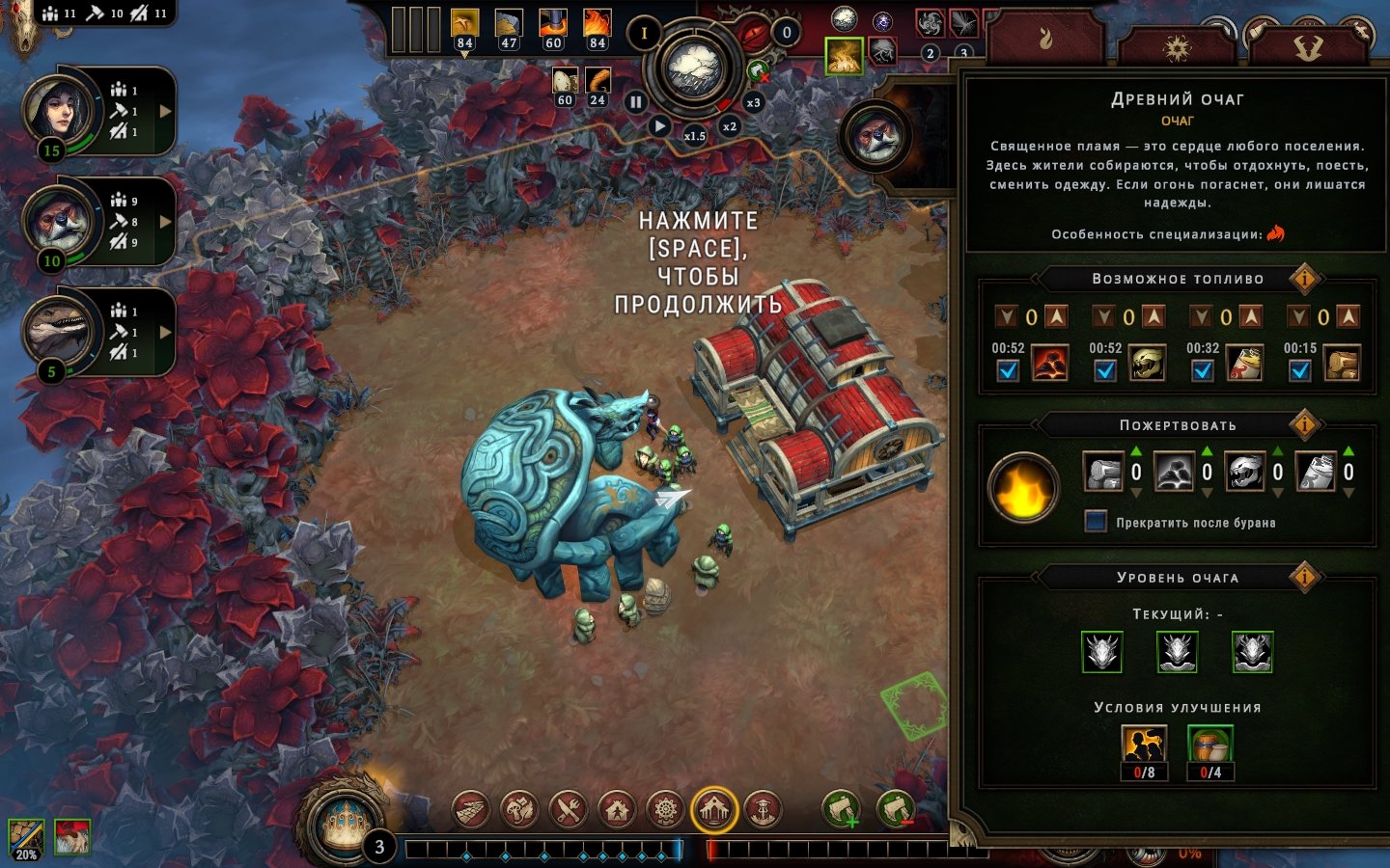 Молитва дровосека – ещё один приятный краевой камень, увеличивающий производство древесины на +1 ценой однократного сжигания всего имеющегося топлива. Множество краевых камней и бонусов влияет косвенно: например, бонус к скорости передвижения поселенцев ускорит производство вообще всех зданий за счёт сокращения времени путешествия до склада и обратно.