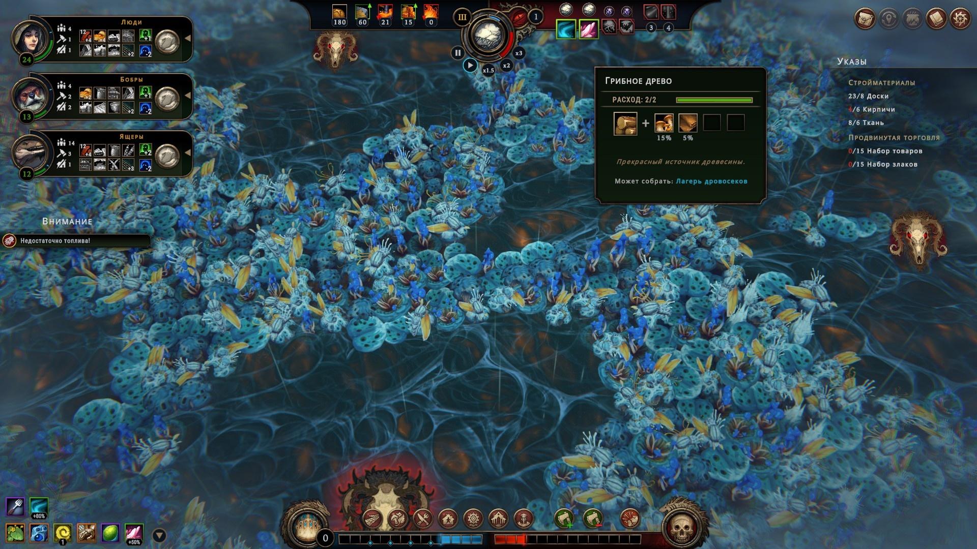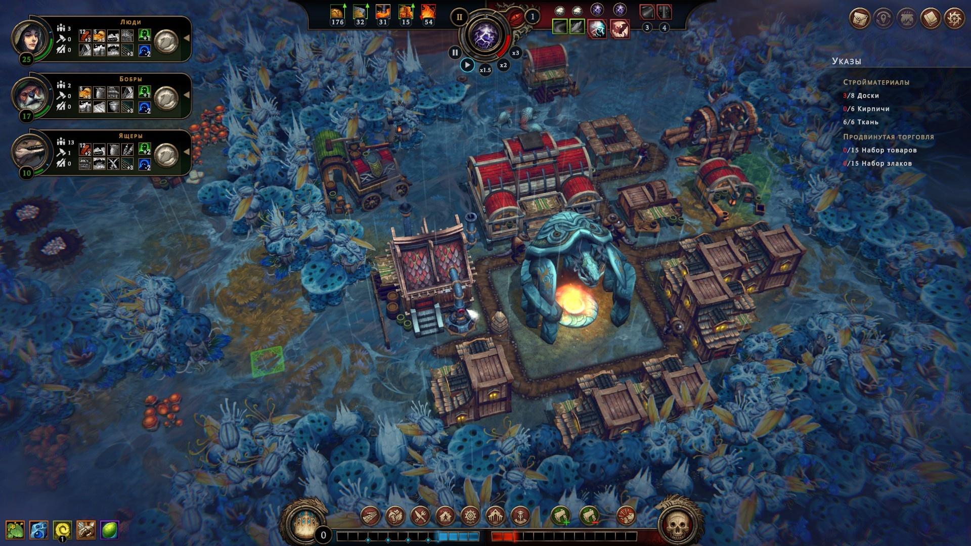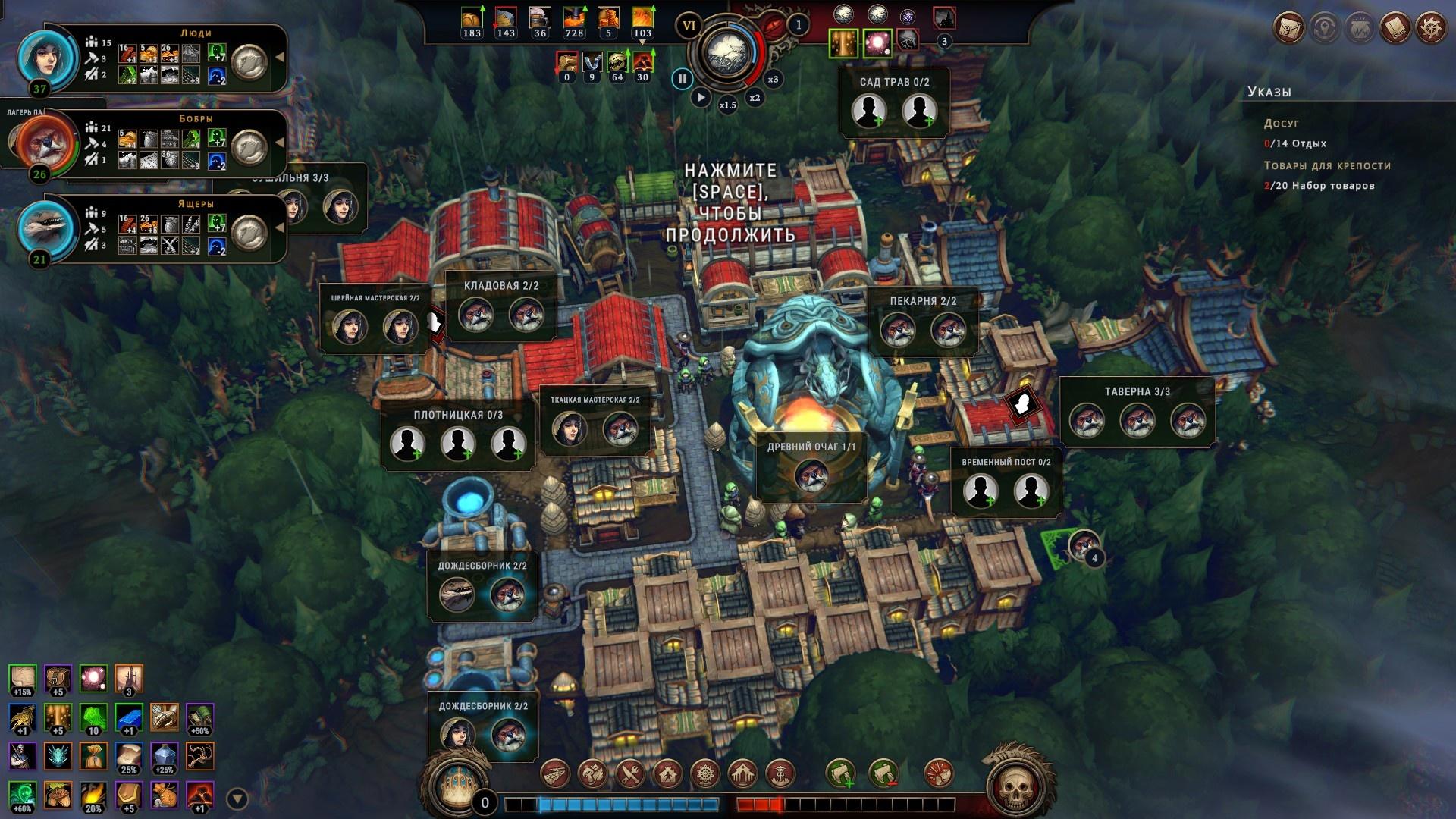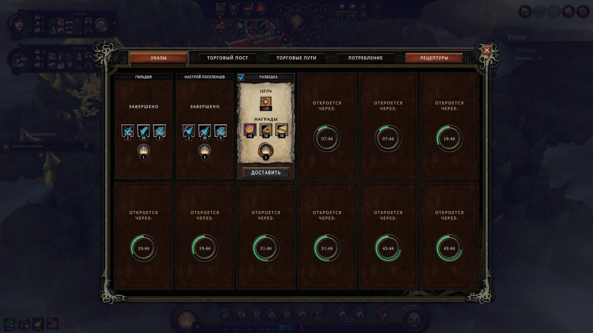 Чтобы получить очки репутации нужно либо выполнять королевские указы, либо исследовать окрестные территории, либо удовлетворять нужды поселенцев, либо налаживать торговые пути. Королевские указы — это мини-задания, за выполнение которых вам выдаются ресурсы, новые поселенцы и репутация, а также сильно снижается нетерпение королевы. В конце концов, это её указы, так что будьте добры, выполняйте их вовремя. Указы, как и чертежи тоже можно выбирать из нескольких вариантов. По моим ощущениям они генерируются совершенно случайно — иногда вы уже выполняете все условия задания и стоит вам только выбрать его в качестве активного — вы тут же получите награду. А бывает и наоборот — в задании просят того, что поселение производить вообще не умеет даже в теории и чтобы появилась такая возможность, нужно найти соответствующее здание в чертежах. Ничего не поделаешь, такова специфика рогаликов.