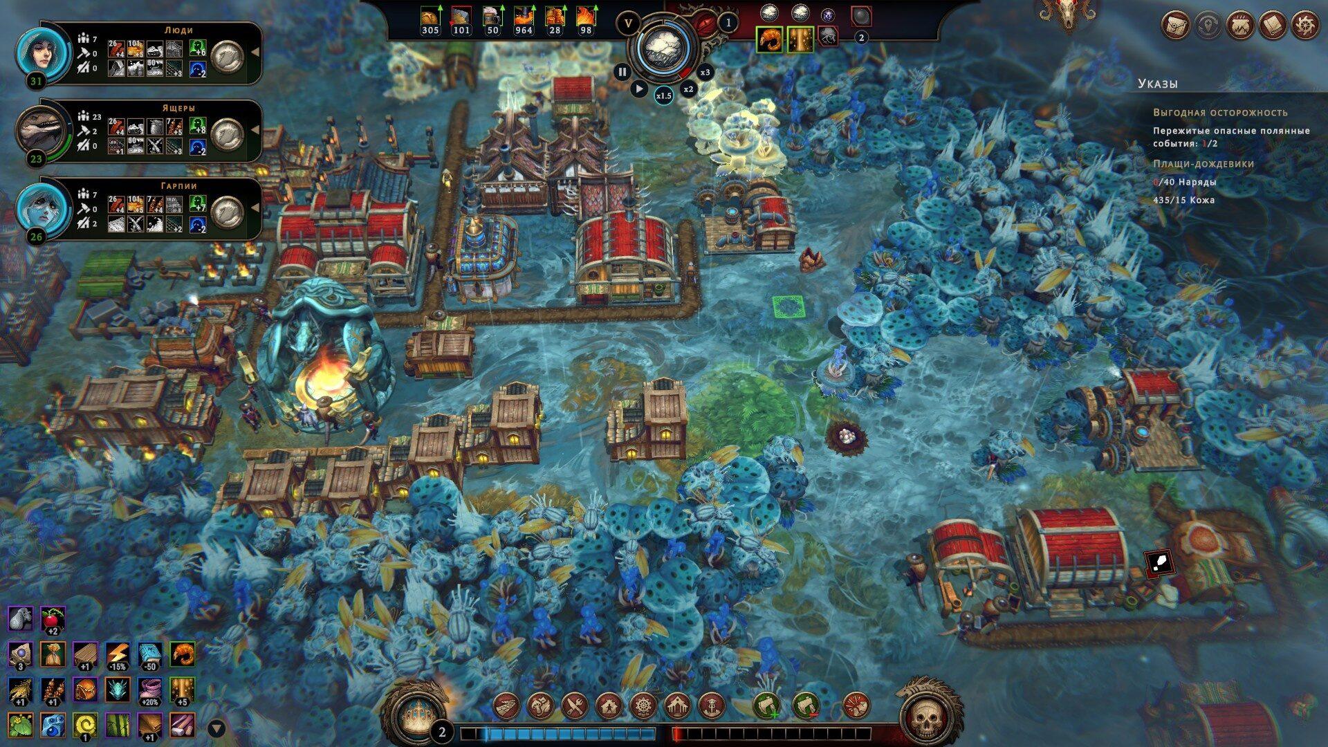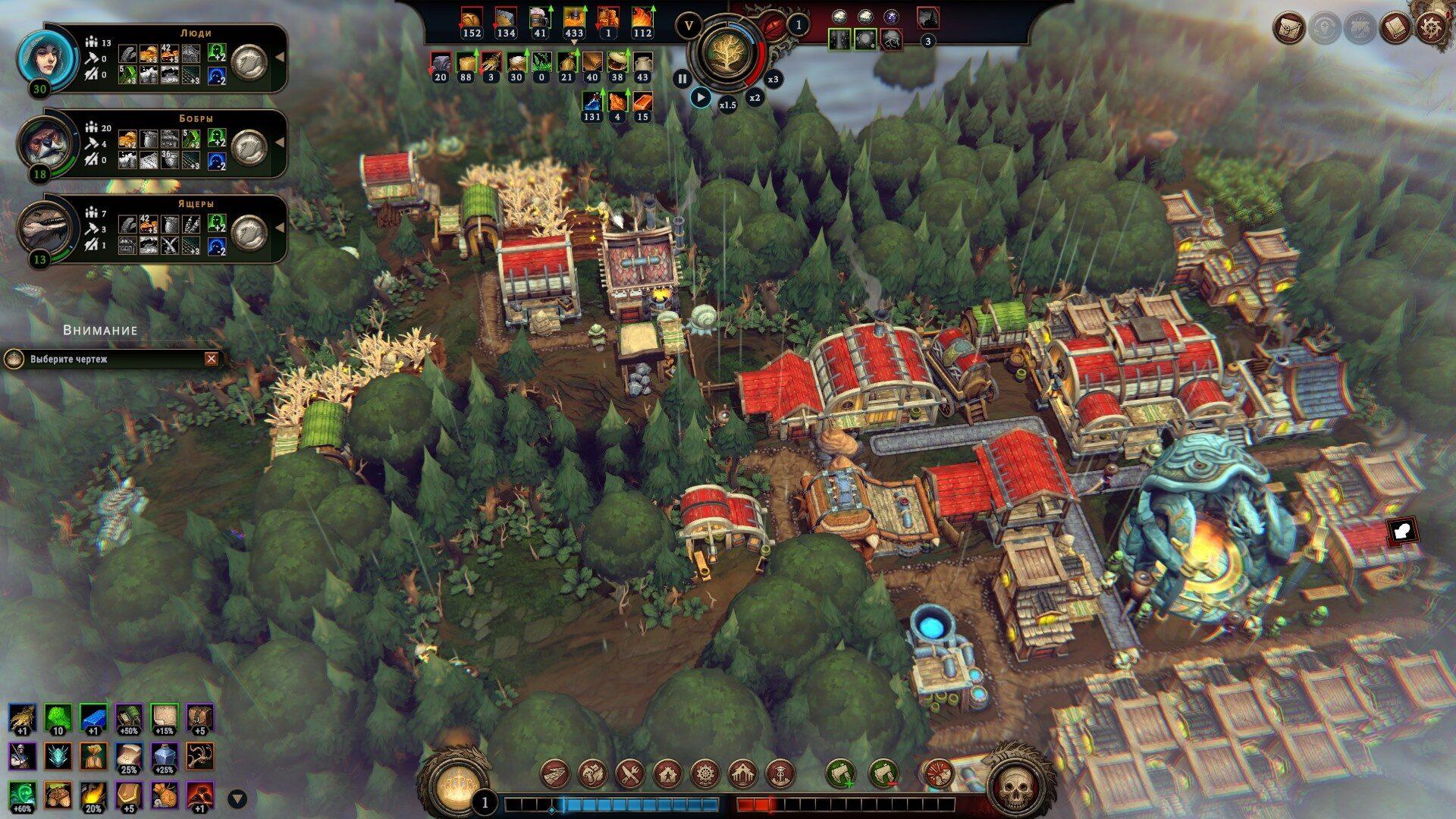 Возникает вопрос — как вообще справиться с тем, что здание на нужный ресурс может не зайти? Разработчики решили ответить достаточно оригинально: а почему, собственно, тот или иной ресурс должен создаваться только в одном здании? И почему ресурс должен создаваться по чётко определенному рецепту? Таким образом, в одном производственном здании всегда будет 3 рецепта, и эти рецепты могут пересекаться с другими зданиями. Например, в коптильне очень эффективно делают копчёное мясо. Однако, оборудование позволяет там же обжигать глину. Правда, в гончарной мастерской этот же процесс будет эффективнее и тратить в разы меньше ресурсов, но при необходимости и в шашлычной вам сделают горшок. А сам шашлык можно делать не только из мяса — местные ценят и грибы, и коренья, которыми можно заменять мясо в рецепте. И подобная гибкость касается большинства производимых и добываемых ресурсов, что несколько нивелирует зависимость от случайности. Хотя, по моим ощущениям, влияние случайности все ещё достаточно велико и на высоких уровнях сложности может запороть весь ран.