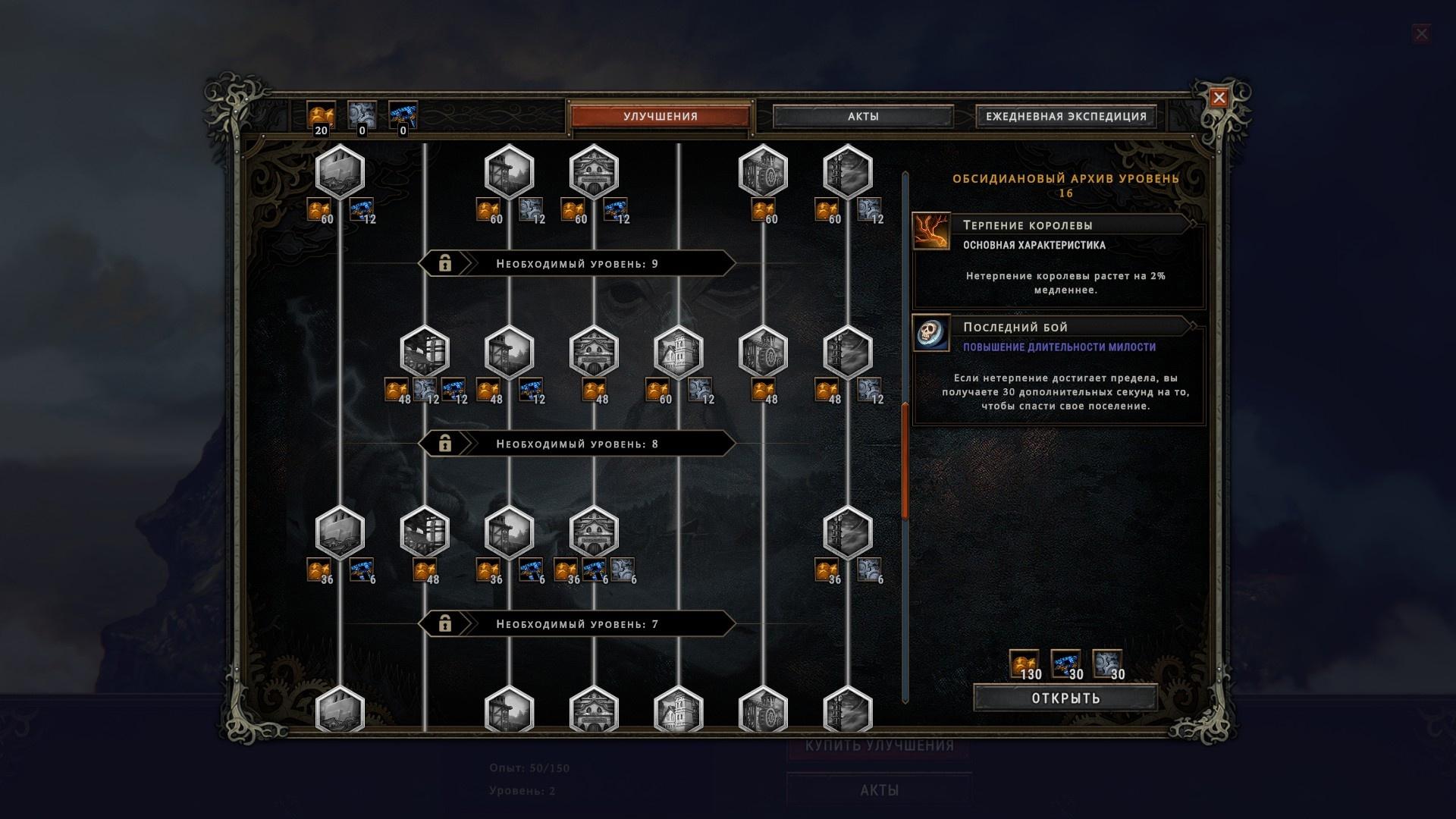 По завершению задания, вас вернут на глобальную карту и выдадут ресурсы, с помощью которых можно улучшать свою столицу. Улучшения дают новые рецепты, открывают новые аспекты игры. В целом, мне нравится, как игра раскрывает себя. По началу новичку доступны далеко не все варианты чертежей, даже не все игровые возможности — вроде торговых путей или распределения потребления ресурсов. Но с опытом, игроку подбрасывают всё новые механики, новые здания и игра постепенно усложняется.