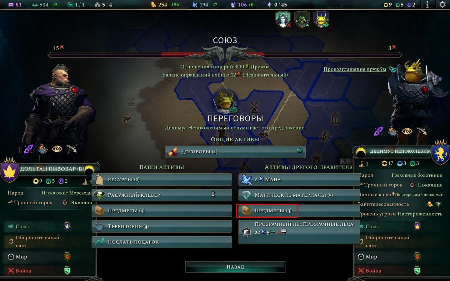 • После того как отношения достигнут 200, в переговорах появится новая категория «предметы».