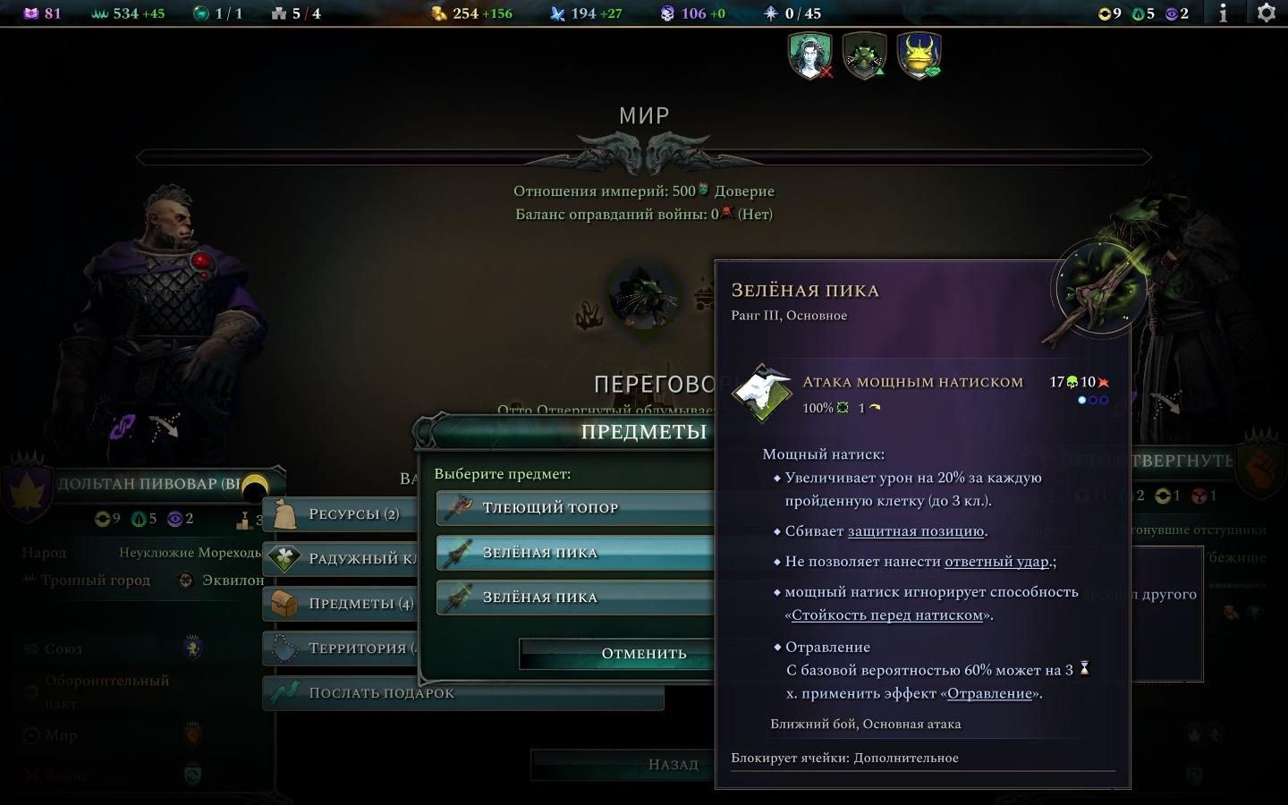 Фракции обычно предлагают 3 достаточно мощных предметов 3-4 ранга. Подружиться с ними можно в самом начале игры, что означает, что уже к 10 ходу вы получите доступ к невероятно мощным предметам, для получения которых в ином случае вам пришлось бы потратить достарточно много времени.