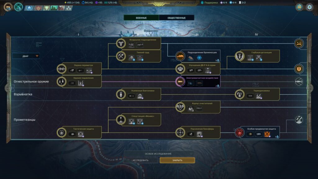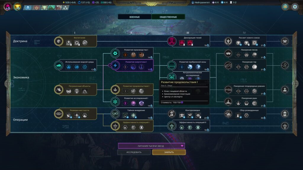 Общественные исследования достаточно стандартны и состоят из трёх независимых веток, которые говорят сами за себя – доктрина, экономика и операции. А вот с военным развитием все немного интереснее. Военные исследования состоят из четырёх веток: расовая, две ветки вооружения в зависимости от расы, и последняя ветка, определяющаяся секретной технологией. В расовой ветке открываются новые и более продвинутые юниты фракции, модули и операции, уникальные для данной расы. Оружие отвечает за модули, которые точно совместимы с юнитами фракции, а также за некоторые операции. Секретная технология имеет в себе всё подряд и заканчивается всегда одним из «оружий Судного Дня» – именно так здесь достигается научная победа.