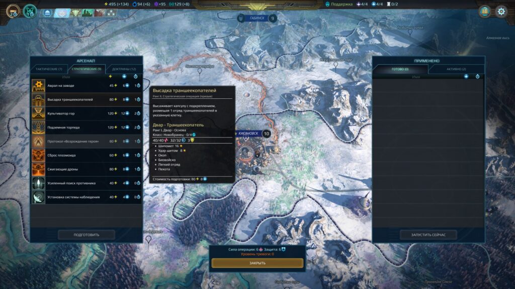 Ветераны Age of Wonders 3 хмыкнут и скажут, что вообще ничего не изменилось, просто названия сменили и всё. В целом, это верно, но сама механика применения магии операций изменилась. Во-первых, очки маны канули в лету, на их место пришли очки тактических операций, очки стратегических операций и ячейки доктрин. Во-вторых, вместе с этими очками, игроки тратят энергию (золото) на активацию операций или доктрин.