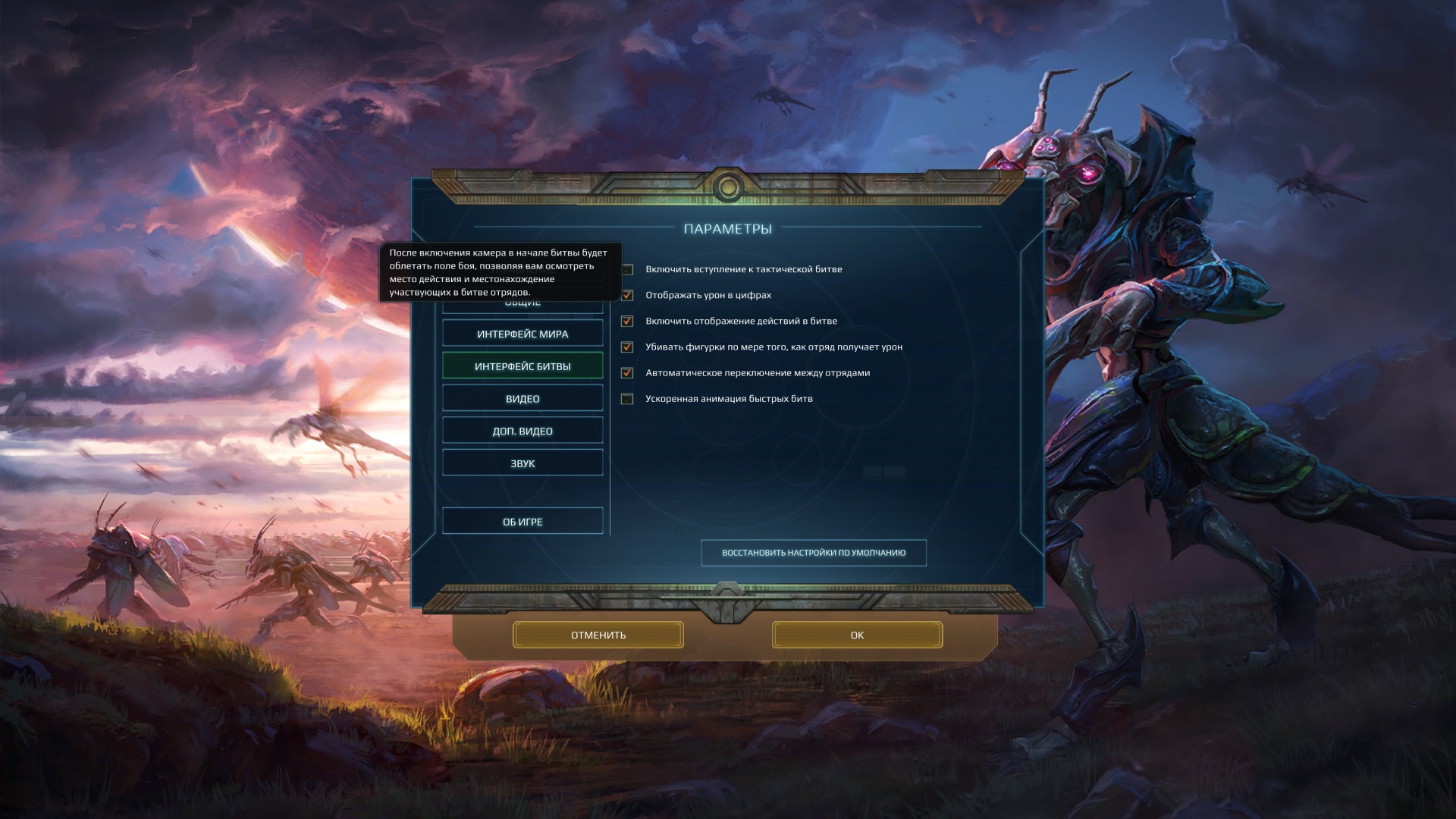 Это интересно: из всех настроек обращу внимание на «Интерфейс битвы — Включить вступление к тактической битве». Эта опция включена по умолчанию и добавляет небольшую и абсолютно бесполезную анимацию облета поля боя перед каждой битвой. Смело выключайте, это сэкономит кучу времени.
