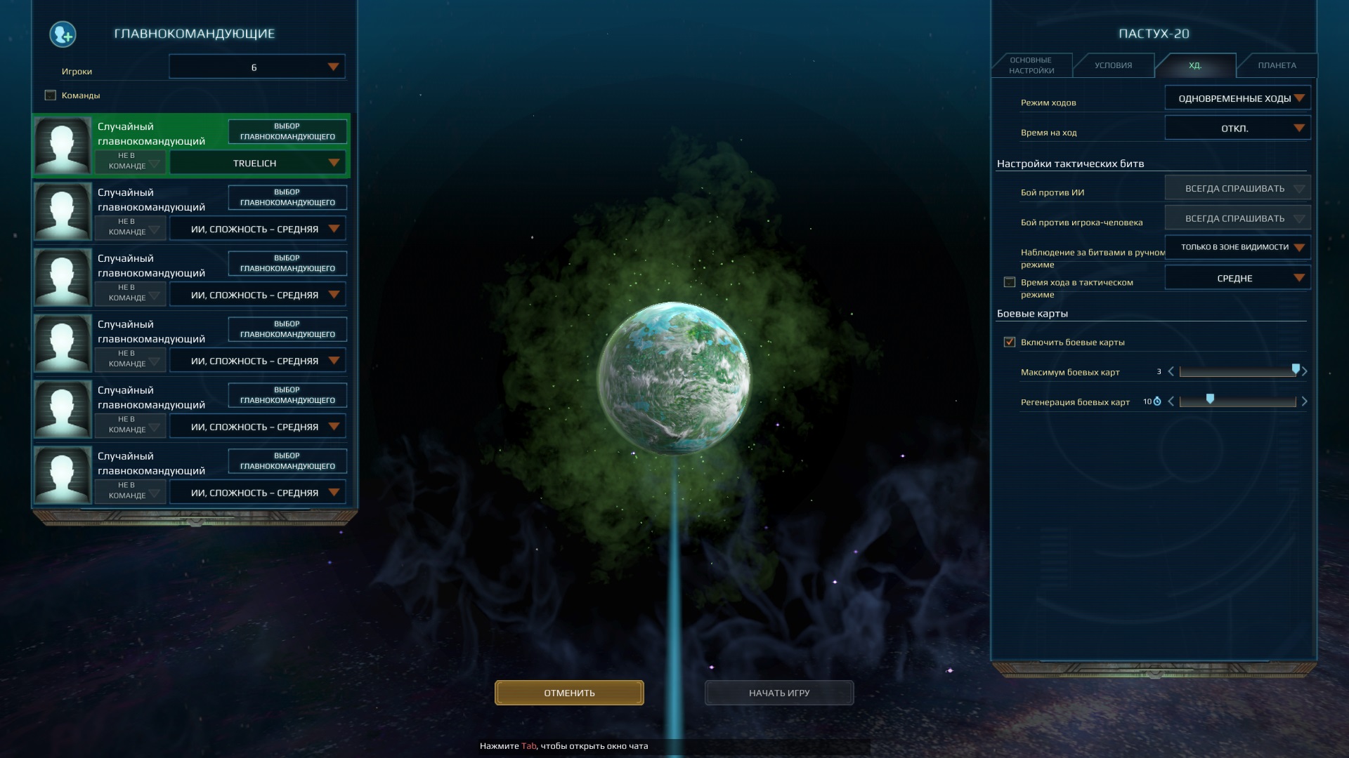 Одиночный сценарий – это стандартный режим игры, более всего напоминающий Civilization. Параметров чуть меньше, чем при сетевой игре, но всё также можно выбрать скорость игры, возможные условия победы, тип и размер планеты и другие настройки.