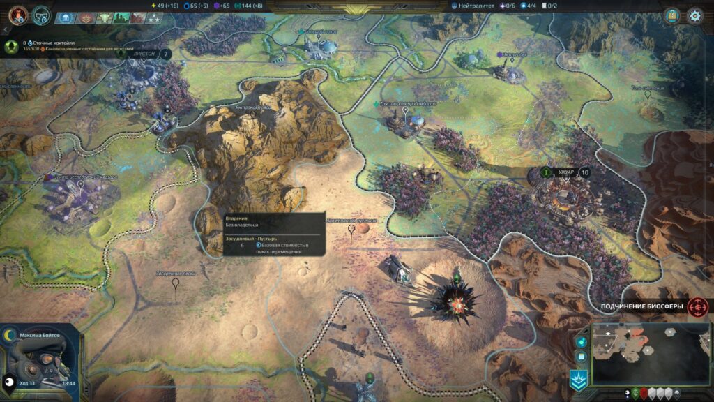 Глобальная карта претерпела наибольшие изменения в Age of Wonders: Planetfall со времён предыдущей части. Теперь вся карта делится на области (привет, Endless Legend), в каждой из которых строго в центре можно разместить либо колонию, либо аванпост и присоединять к поселению, тем самым расширяя свои границы. Районы отличаются добычей ресурсов. Области победнее можно присоединить без боя, а вот районы с хорошим производством обычно охраняются нейтралами или войсками малых фракций.
