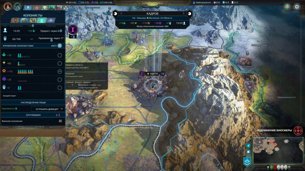 Колонии производят основные ресурсы – еду, производство, энергию и науку. Колонистами теперь можно управлять и выбирать, на какой ресурс сделать упор. Как только накопится достаточное количество еды, население колонии и добыча ресурсов вырастет. А при достижении определённого количества колонистов (4, 8, 12, 16), можно будет присоединять новые области к колонии.
