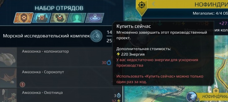 Не пренебрегайте возможностью производить энергию в ваших городах. Ведь за энергию можно использовать крайне мощные тактические операции, а также мгновенно покупать юниты и здания. Одна из тактик игры – полностью сосредоточиться на энергии и побеждать врага за счёт большого числа операций и быстрой покупки юнитов и строений.