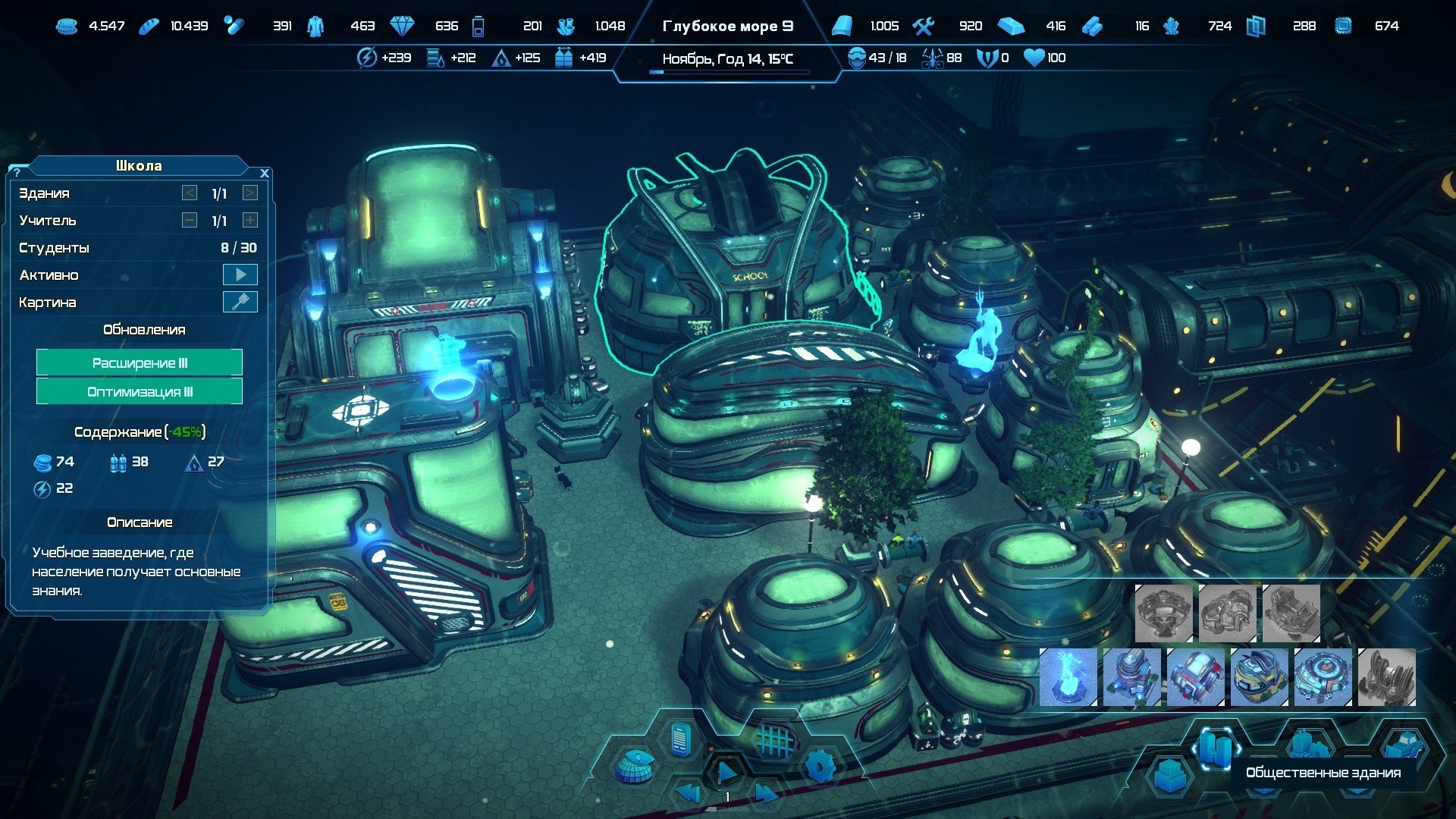 Одна из вещей которые мне сильно нравится в играх, это возможность улучшения построенных зданий. В игре наглядно видно как улучшение производительности увеличивает производство, а оптимизация расходов на производство экономит сырьё. Причём, чем больше ваша база, тем ощутимее становится экономия на сырье и увеличение количества выпускаемой продукции при улучшении производства. Не пренебрегайте этой возможностью, в отличие от многих игр, в Aquatico улучшение зданий действительно даёт свои плоды, а не является просто прикрученной для галочки функцией.