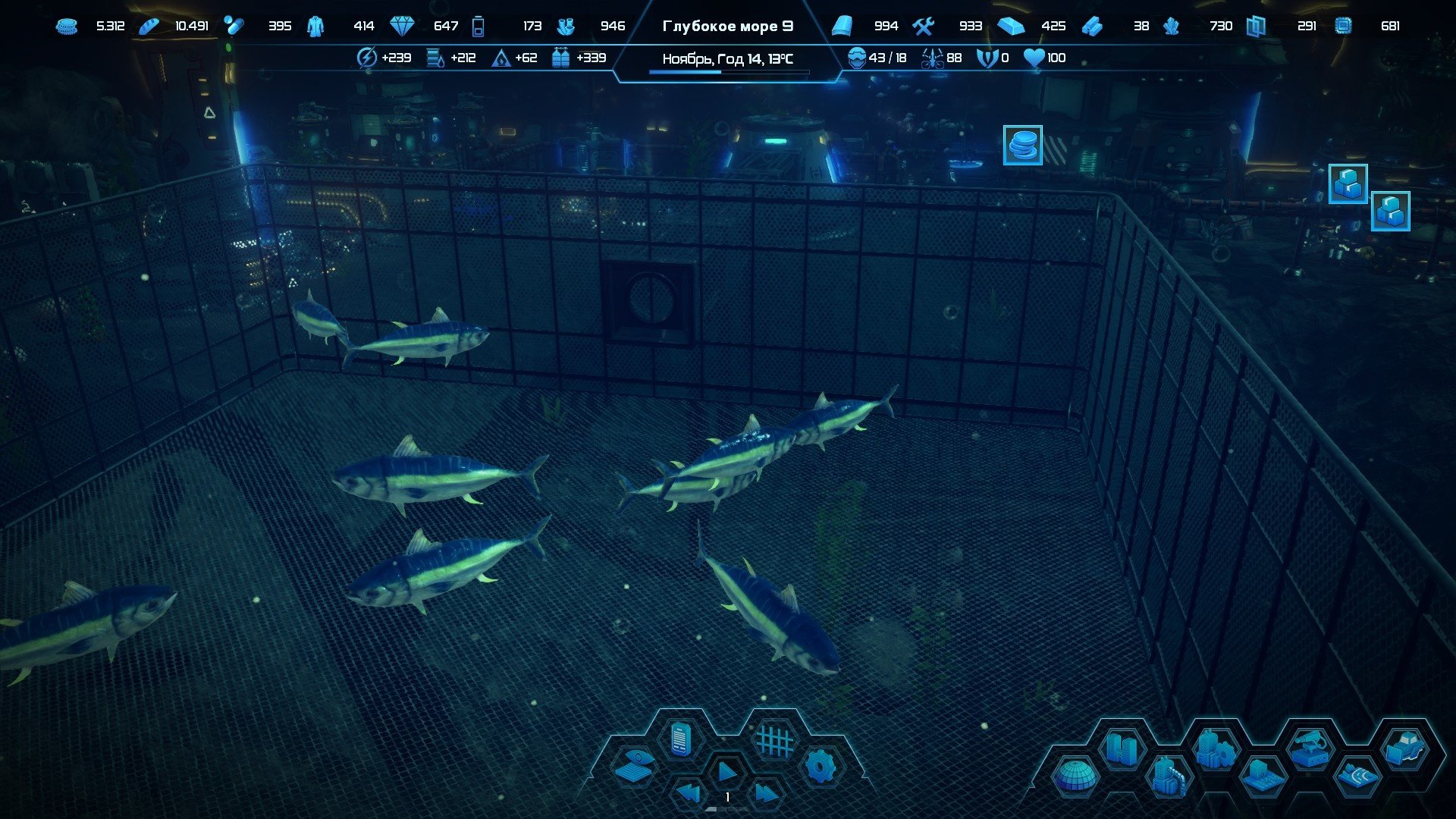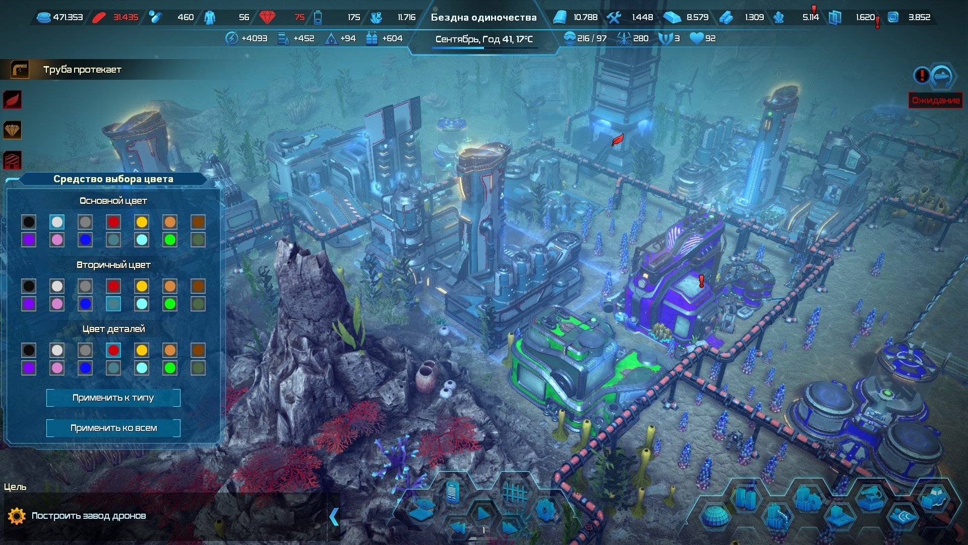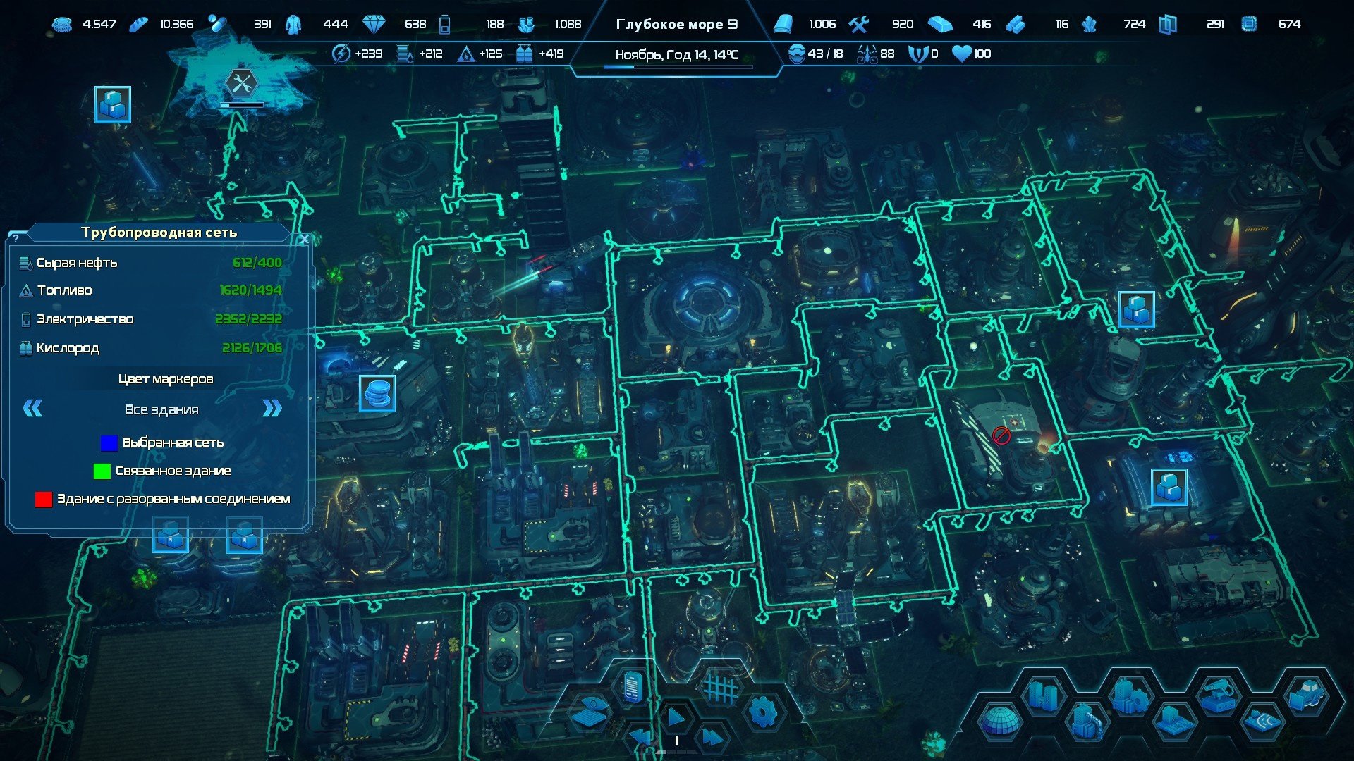 Но в чём же нюанс? Нюансов два! Первый, одно здание может быть подключено только к одной трубе. Казалось бы ничего сложного, но лично у меня первые пару часов из-за этого постоянно случались просчёты с разметкой местности под здания и трубопровод. Вторая механика менее очевидна: у трубы есть ограниченная пропускная способность и осознание этого приходит во второй половине игры, когда ваша подводная база уже разрослась до размеров ПГТ. В самой игре об этом не сообщается заранее, поэтому когда проблема явила себя свету и я осознал масштабы проблемы, моё настроение резко погрузилось на самое дно, прямиком к моей мэрии. Сырьё из одного конца базы не поступает в другой конец, где развёрнуто производство, решается эта проблема только наличием личного опыта игры или если прочитали обзор до этого места. На первом прохождении когда логистические цепочки оказались перегружены я просто с помощью торговца докупал необходимое и отправлял на стройплощадку гигабазы. А вот уже на втором забеге в свободной игре, имея опыт, я заранее планировал трубопроводы с минимальным «рукавом» транспортировки, но даже тогда начинают проявляться эти проблемы.