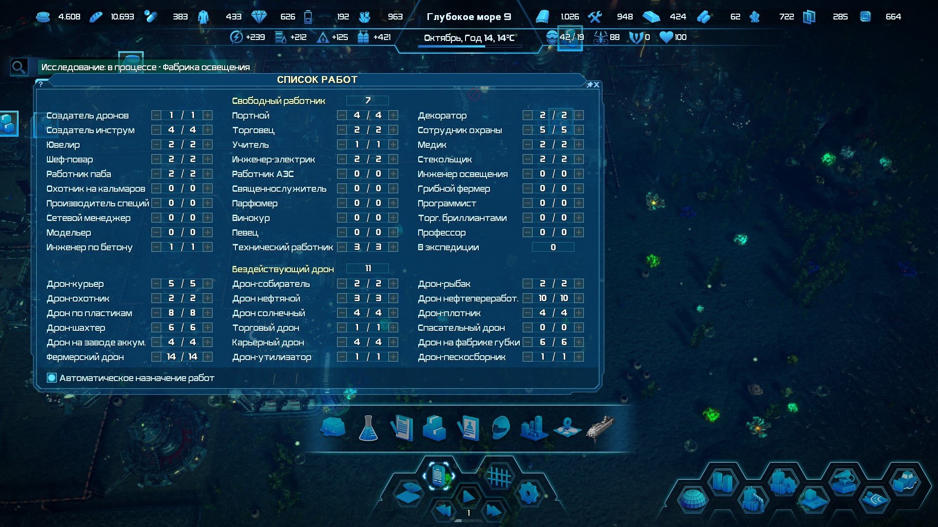 Всех работников-людей необходимо распределять. Можно делать это в рукопашную, а можно поставить галочку автоматического распределения и забыть про это не самое интересное занятие на всю игру.