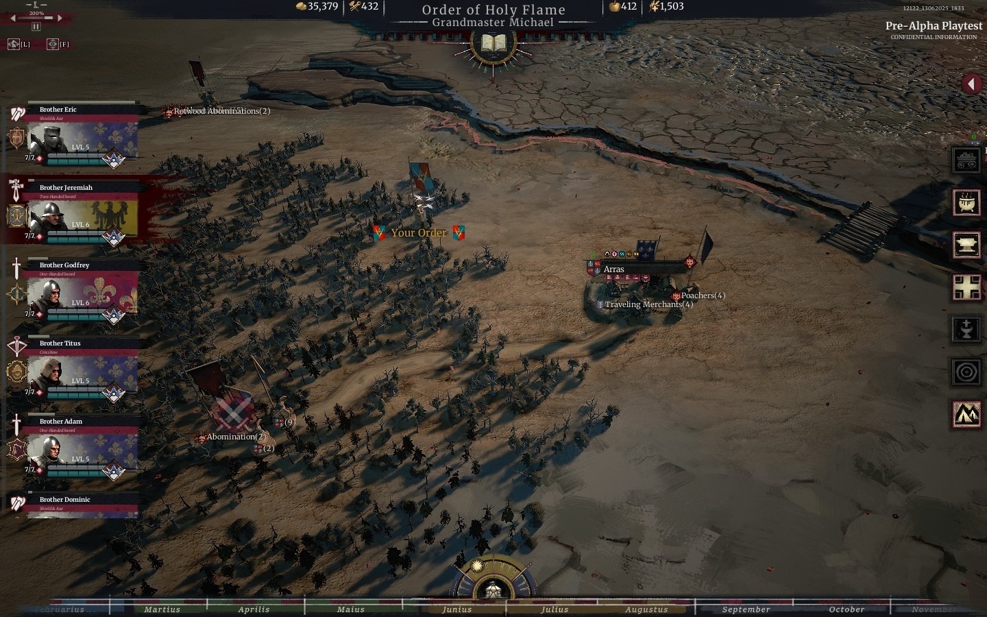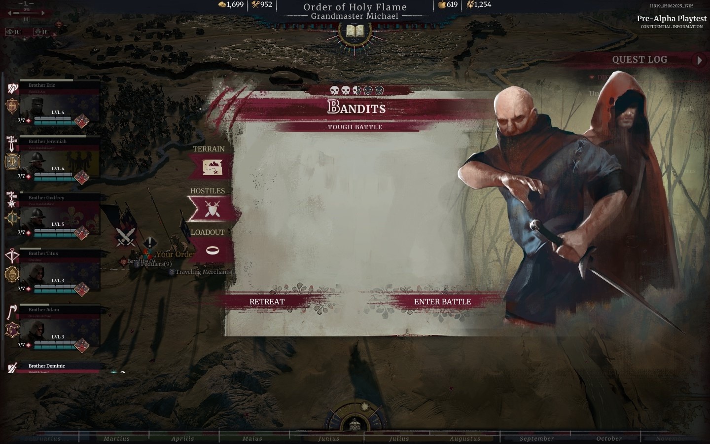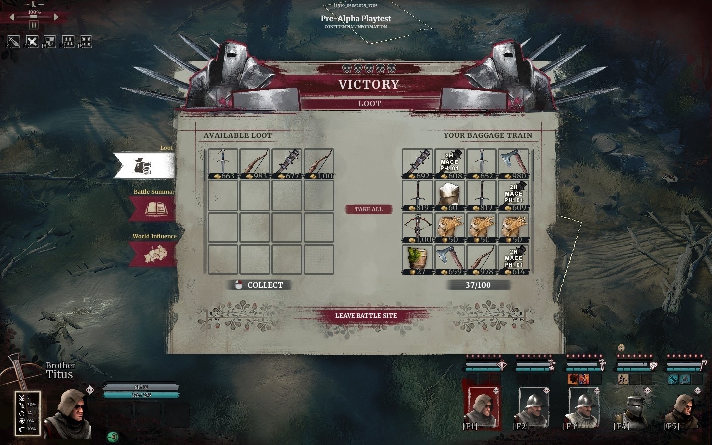 Безусловно, игра ещё далека от своего окончательного облика, но уже сейчас виден целый ряд структурных проблем разной степени значимости. Во-первых, игра заметно проще своих источников вдохновения хотя бы тем, что, пока ваш отряд не требует регулярного денежного содержания. Это можно обосновать сюжетно (всё же игрок возглавляет не банду наёмников, а орден крестоносцев), но, с той же лорной стороны — это обстоятельство не мешает вам набирать людей в орден буквально с улицы и за деньги, а с игромеханической точки зрения — это позволяет легко сводить дебет с кредитом… ввиду отсутствия последнего. Кроме того, это лишает размер отряда одного из важнейших ограничителей общей численности.