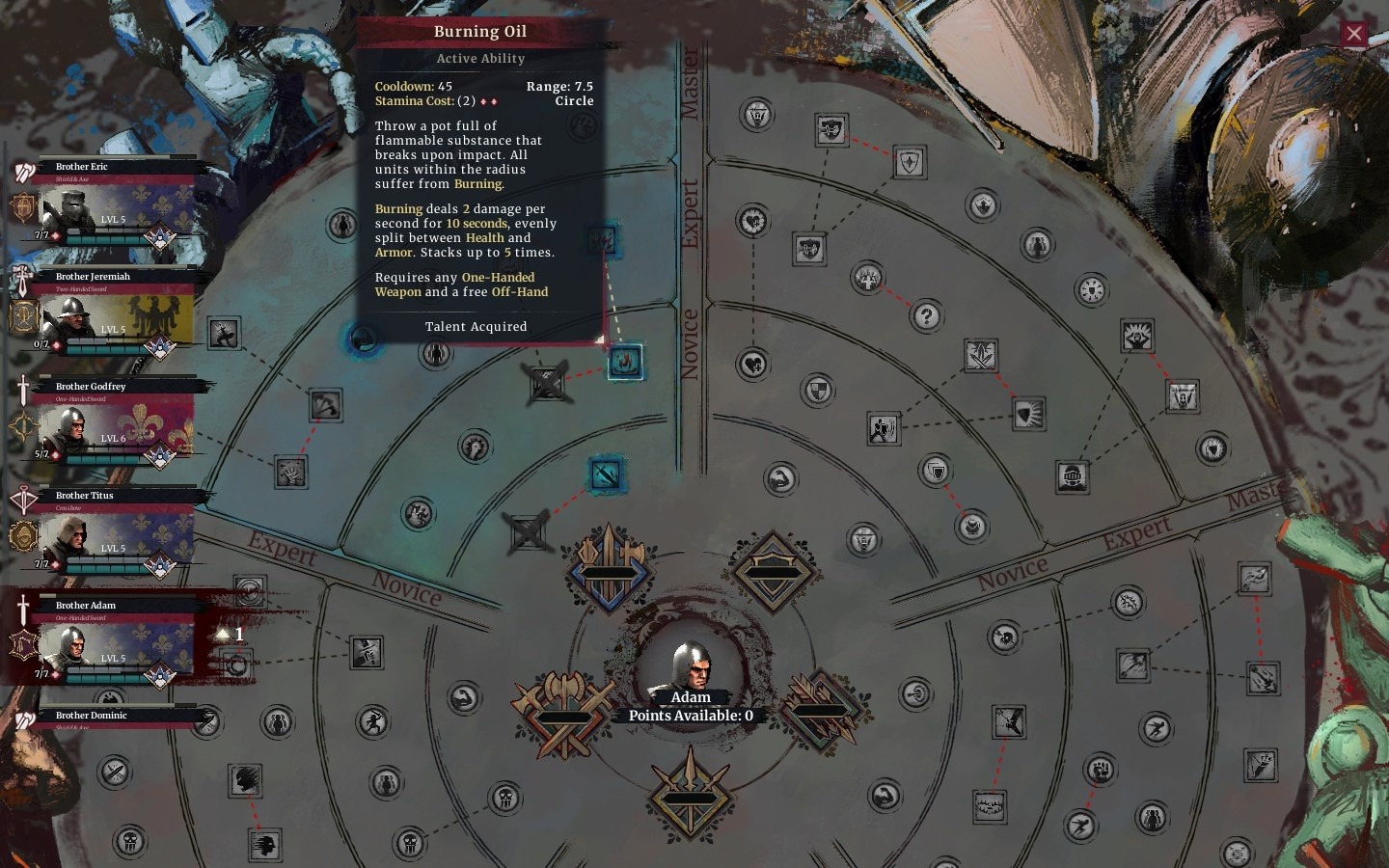 Ролевая система достаточно обширная, а определяющий фактор в ней — оружие, которое в данный момент в руках у бойца (то есть, команду можно достаточно гибко настроить для определённых боёв). Прокачка разделена на четыре ветки, охватывающие то или иное оружие и их сочетание (длиннодревковое, одноручное и щит, одноручное без щита, дальнобойное). Каждый боец располагает набором активных и пассивных способностей, зависящих не только от прокачки, но и от оружия в руках. Скажем, «воровские» приёмы с заходом за спину можно совершить только имея свободную руку, поэтому двуручное оружие или щит станут помехой для исполнения приёма. Многие элементы прокачки взаимоисключающие. Часто придётся выбирать между двумя похожими способностями или между пассивным перком и постоянным бонусом к базовым характеристикам, вроде силы или ловкости.