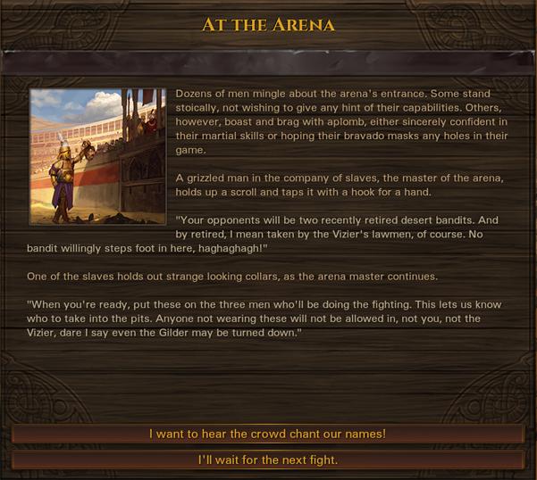 В отличие от привычных контрактов для наёмников, в гладиаторских боях игрок ограничен командой из трех бойцов на выбор, которым предстоит сразиться с различными противниками. Другое отличие от обычных контрактов – всегда известно, кто ваш следующий противник и в каком количестве он будет представлен. На арене вам предстоит сразиться со зверями, рабами, пойманными бандитами, профессиональными гладиаторами и т.д. Забудьте про долгие путешествия по карте, неожиданные засады и приготовьтесь к щедрым наградам за быстрые бои на арене – но только в случае победы. Если вы хотите быстро начать карьеру гладиатора, не можете выбрать тематический вариант старта игры «Гладиаторы».
