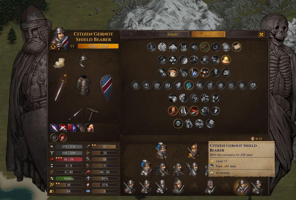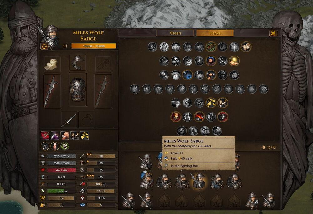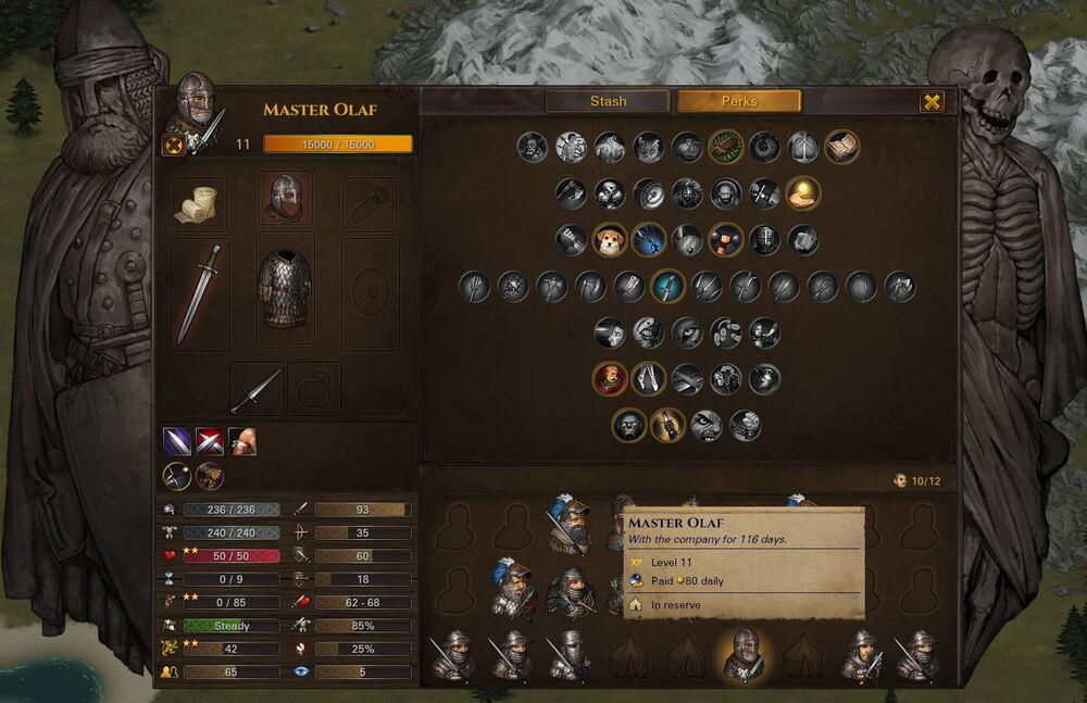- Основные умения: Resolve, Melee Skill, максимальная Fatigue