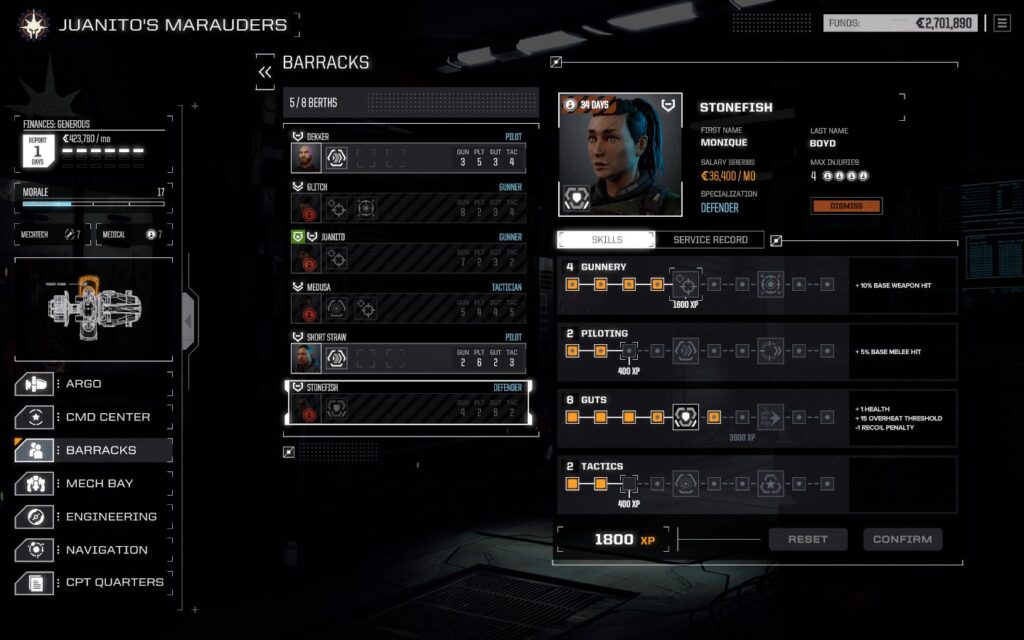 У каждого меха есть свой «мехводитель». Пилотов можно нанимать на рынке наёмников и все они имеют 4 ветки умений: стрельба, пилотирование, выдержка и тактика. Стрельба отвечает за точность стрельбы, пилотирование за успех рукопашной атаки и увороты, выдержка за выживаемость пилота и тактика — за удары непрямой наводкой. В каждой ветке есть специальные умения вроде возможности стрельбы по нескольким целям и прицельного выстрела, но по факту не все из них реально полезны в игре.