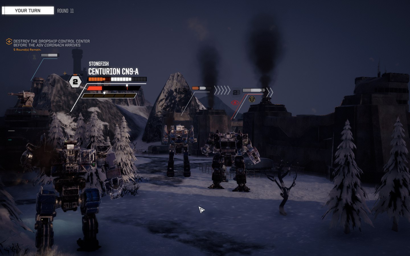 Каждый юнит здесь имеет очки инициативы, от 1 до 5. Чем тяжелее мех — тем меньше очков инициативы у него. Битва делится на несколько раундов, которые показываются в шкале сверху экрана. В первом раунде по очереди делают ход юниты игрока и врага с инициативой 5, во втором — с инициативой 4 и так далее, затем всё начинается заново. В общем плане эта система даёт ощущение того, что лёгкие мехи — действительно лёгкие, а до тяжёлых ход доходит достаточно долго.