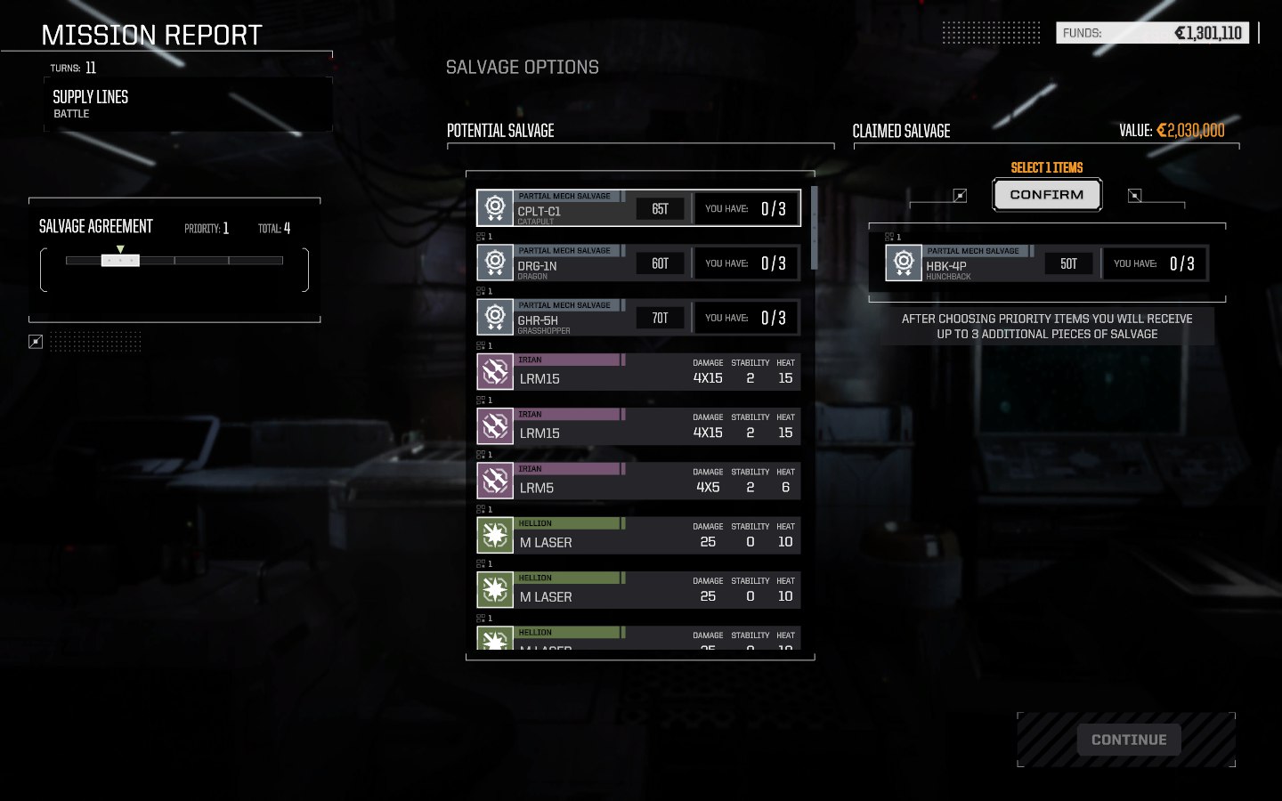 После боя можно подобрать остатки вражеских мехов. В зависимости от выбранных условий контракта (можно торговаться), можно выбрать некоторое количество деталей, которые удастся точно взять с собой, а остальные при этом рандомно выберутся из общего списка.