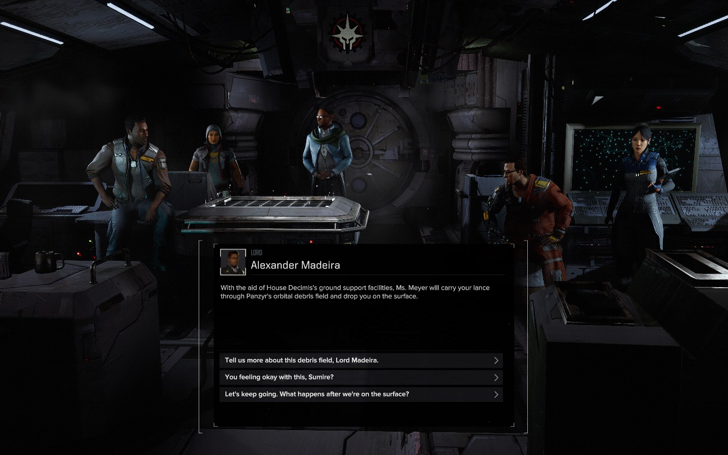 Так выглядит корабль-база игрока, в котором находится его небольшой отряд наёмников и несколько мехов.