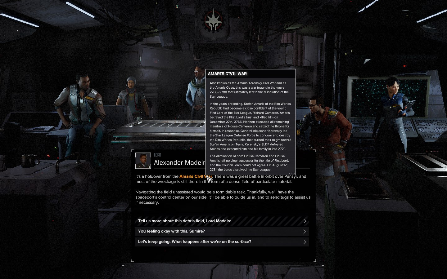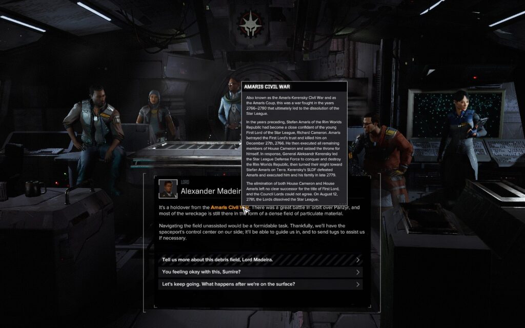 Разумеется, он тоже ни на что не влияет. Иногда в диалогах появляются жёлтые слова, которые являются своеобразной вики-сноской, позволяющей лучше узнать вселенную Battletech.