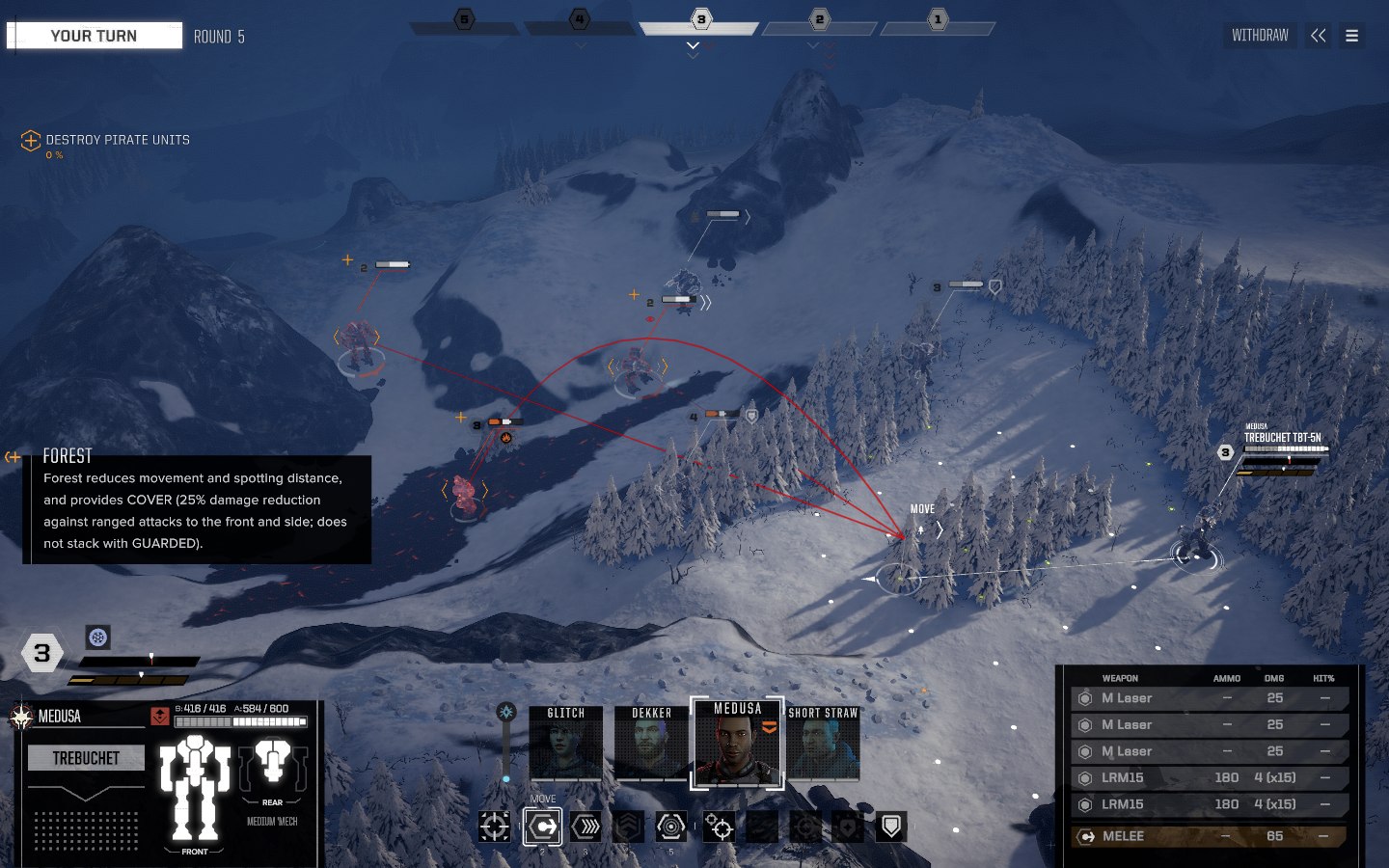 А вот рандом в Battletech в основном не раздражает. Здесь редко удастся увидеть шанс промаха 90%, стреляя в упор (привет, XCOM). Перемещая своих мехов, можно заранее посмотреть, какой будет шанс попадания на какой позиции и будет ли вообще возможность выцелить врага (эта возможность показывается красной линией). Даже если игрок не попадает из одного оружия, то он может попасть из другого, а обычно у мехов их 3-5 и залп можно делать сразу из всех. А при стрельбе ракетами вылетает целая куча снарядов (особенно если у меха 3 ракетомёта на 15 ракет), из которых одни могут попасть, а другие пролететь мимо. Всё это создаёт приятное психологическое ощущение того, что часть выстрелов всегда попадает в цель и наносит урон, и это раздражает куда меньше, чем классические «не попал, 0 урона».