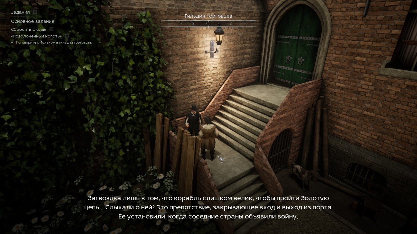 До сих пор неизвестно, почему бы всем людям не выйти из города через те ворота, через которые герой в него вошёл. Но самая главная фишка в гениальном плане вашего начальника следующая: он предлагает усадить всех лояльных граждан на корабль, и неожиданно всем свалить. Ладно, допустим. Для того, чтобы корабль вышел, нужно убрать преграду – заградительную цепь. Для этого необходимо спустить её, запустив механизм в двух башнях. И поэтому ваш начальник отдаёт следующий приказ: отправиться в порт и спустить цепь с помощью механизма в первой башне.