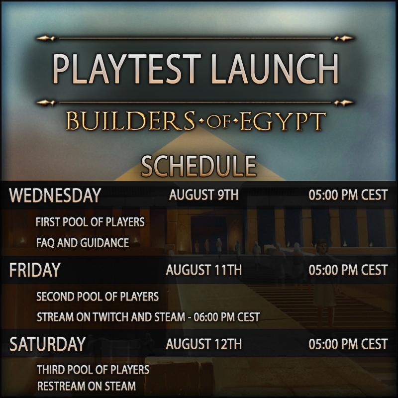 С 9 по 12 августа 2023 все желающие смогут принять участие в тестировании градостроительной стратегии о Древнем Египте Builders of Egypt. Тест пройдёт в три этапа, в рамках которых три группы игроков будут постепенно допущены к игре. Разработчики заявляют, что принять участие смогут абсолютно все желающие – к субботе приглашения будут высланы 100% подавших заявку.