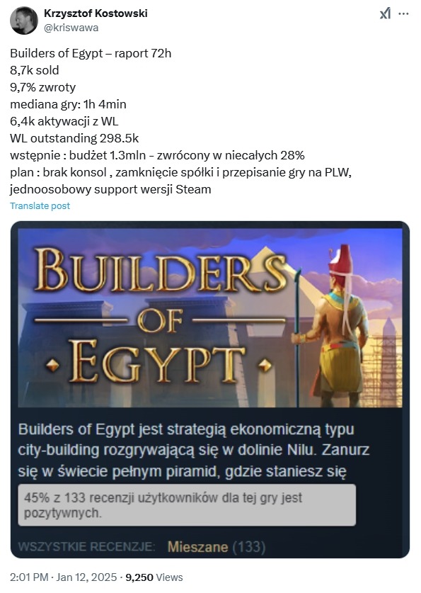 CEO компании-издателя PlayWay S.A. поделился статистикой в своих соцсетях. По его словам, из бюджета размером $1,3 миллиона было окуплено лишь 28%. За первые 72 часа было продано лишь 8,7 тысяч копий игры, 10% было возвращено.