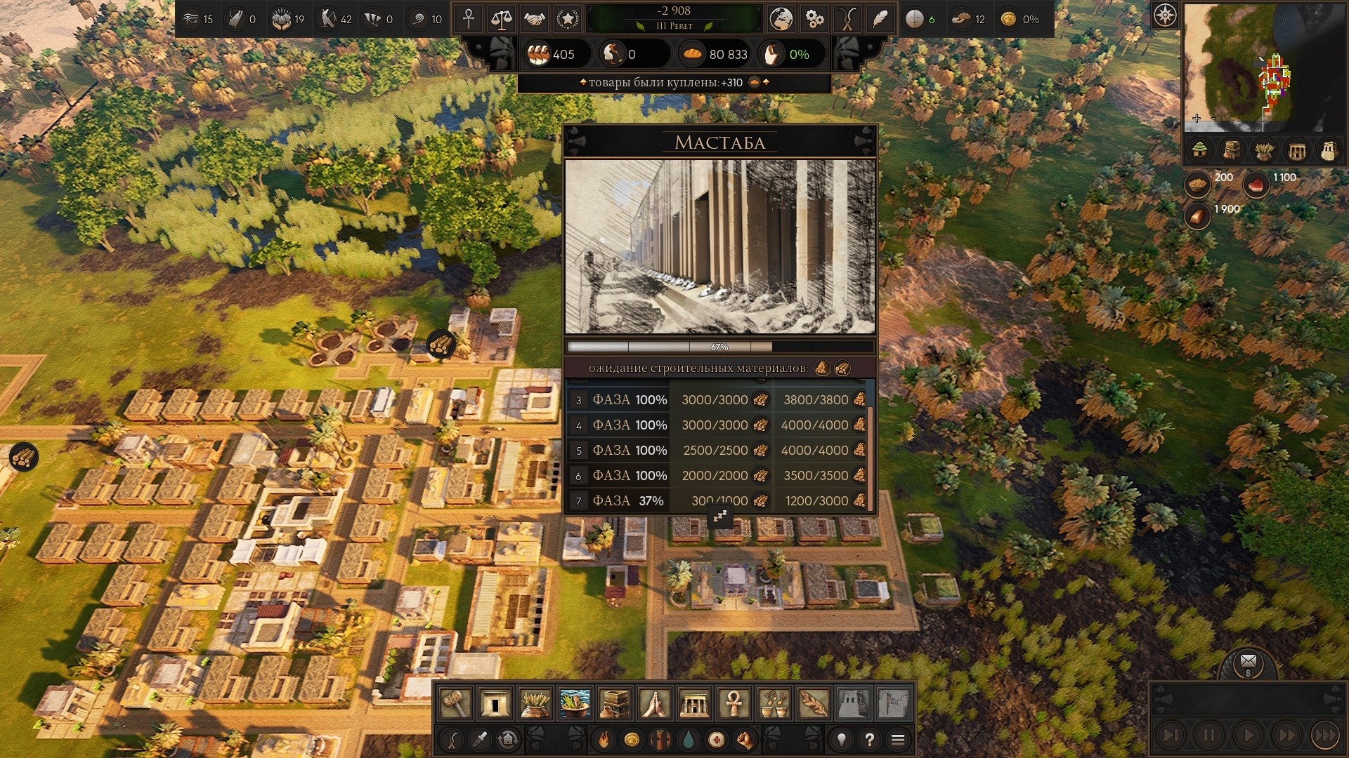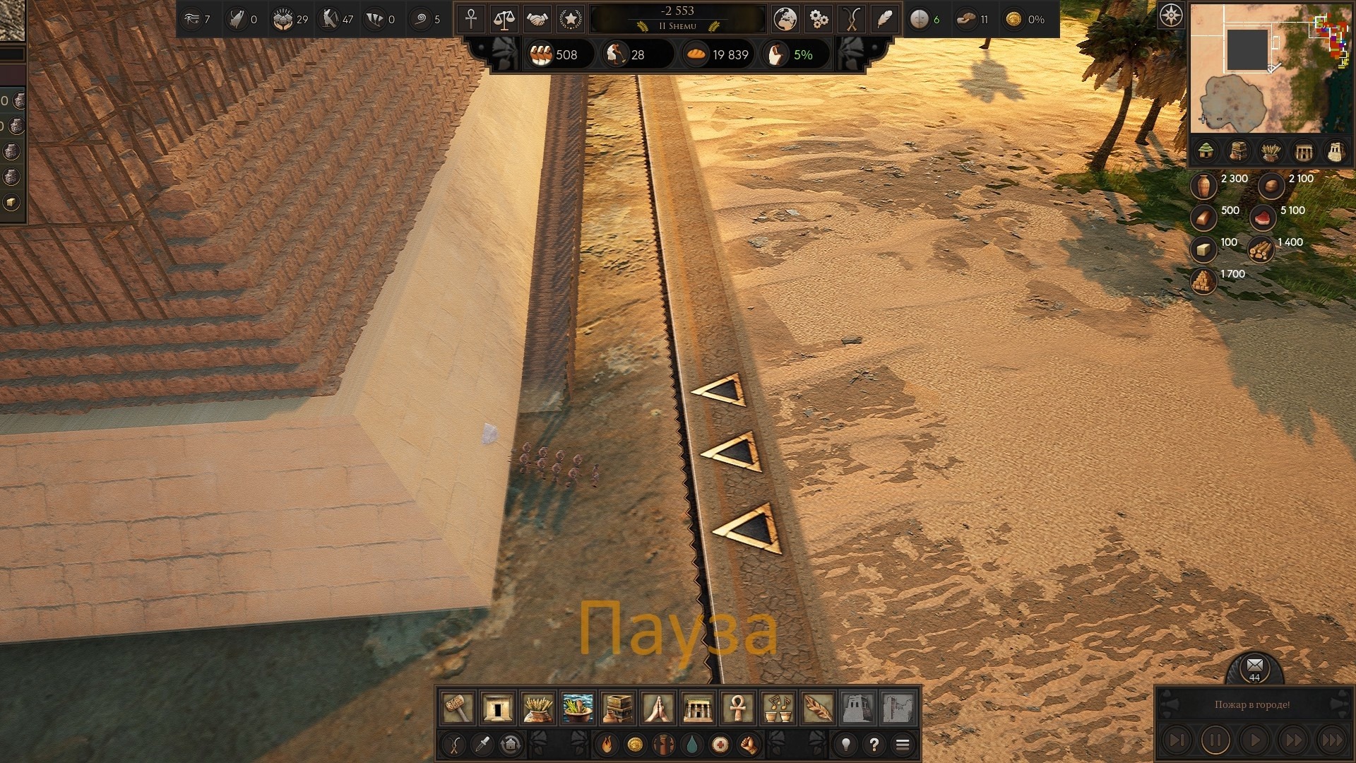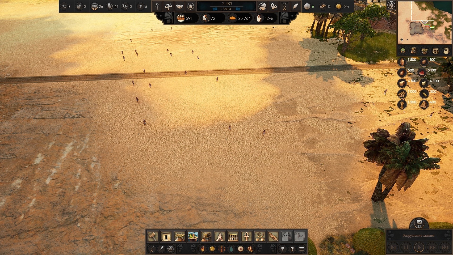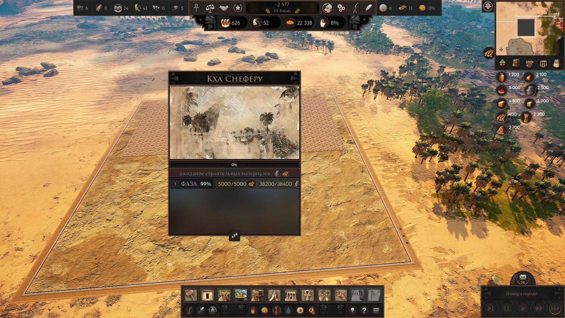 Гигапирамиду, гигахрам и всё в таком же духе. Это невероятно скучно. Вам просто необходимо на протяжении часа-полутора подвозить в огромных количествах ресурс на строительную площадку для того чтобы увеличивался прогресс строительства, отображаемый в процентах. Вот весь геймплей в миссиях кампании. Меняются только декорации от карты к карте, доступные на карте ресурсы, набор ресурсов, продаваемый вашими соседями, но ничего интересного для игрока, никакого вызова, никакого требования нестандартных решений, ничего подобного нет. При этом из-за того, что строительство памятников требует большого количества ресурсов, вам просто нужно в режиме ждущего охотника мотать время на скорости х6, пока модельки переносчиков будут курсировать между складом и строительной площадкой. А это занимает уйму времени: на одну такую миссию я убивал по полтора часа. Вам требуется только добиться хотя бы нулевого соотношения дебета и кредита, чтобы, пока вы носите известняк к пирамиде в количестве 30к штук, ваш полис не схлопнулся.