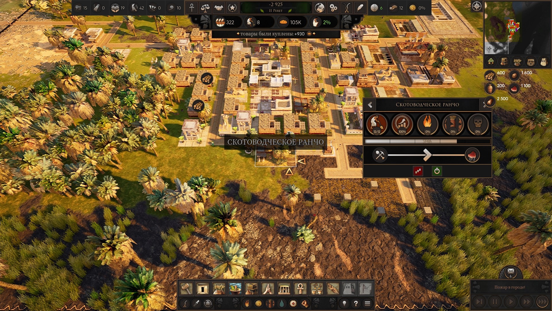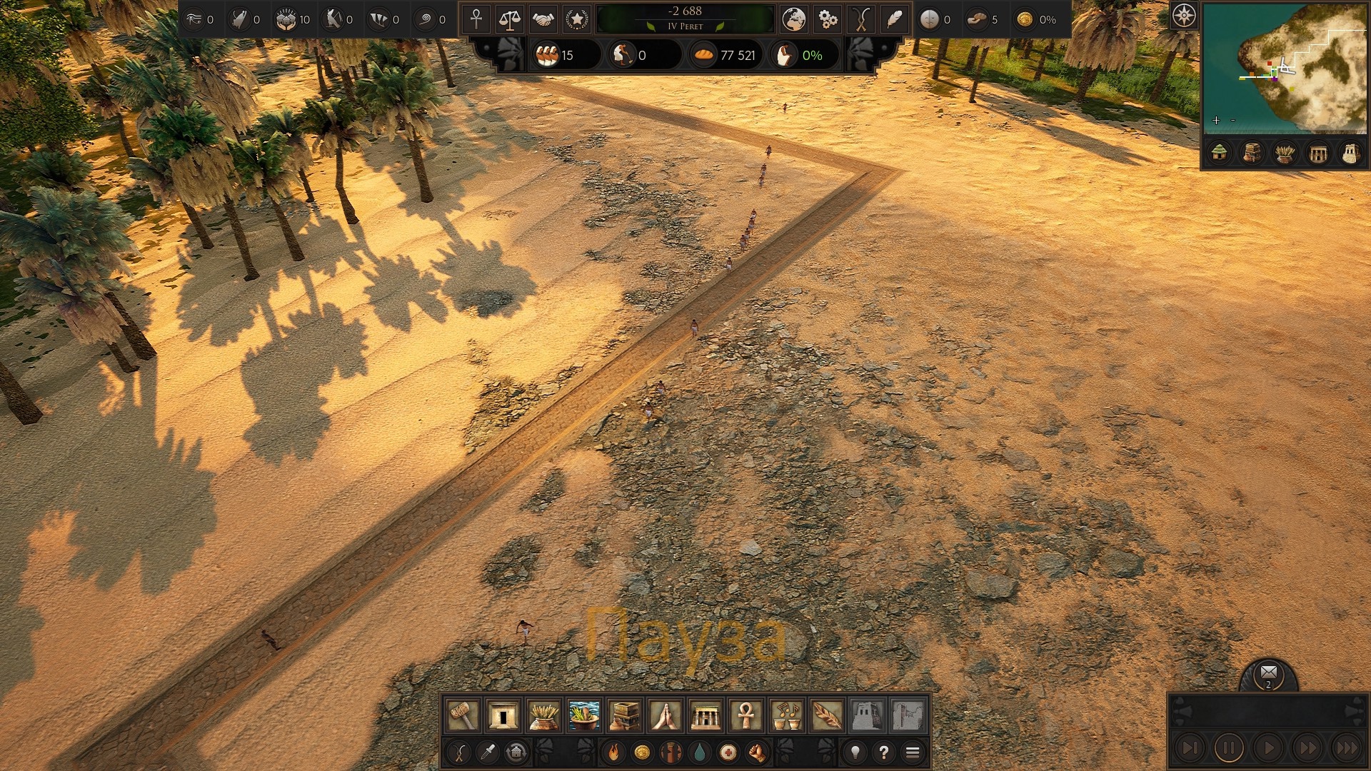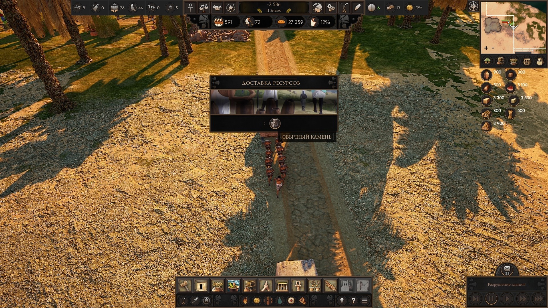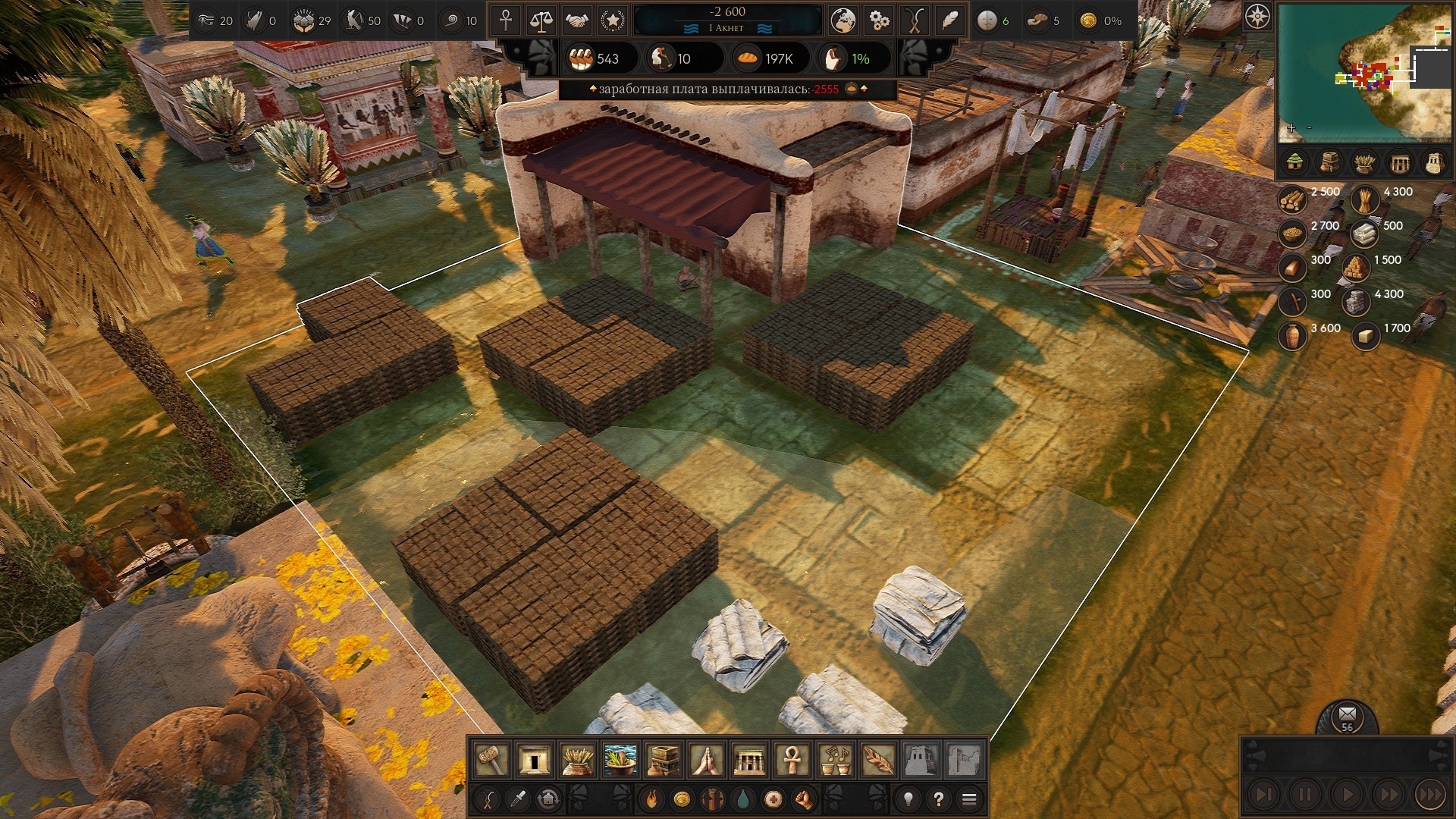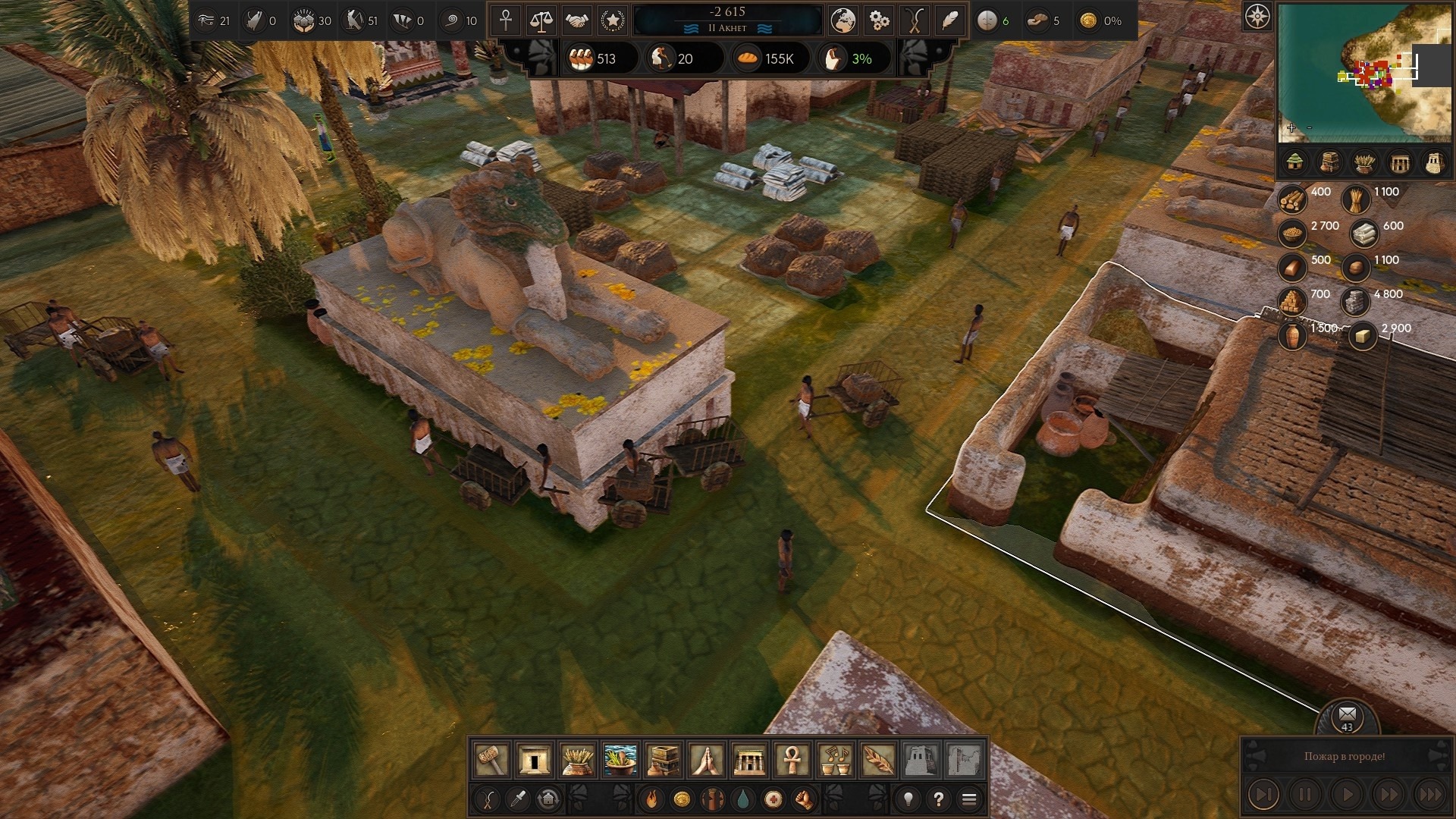 Гигапирамиду, гигахрам и всё в таком же духе. Это невероятно скучно. Вам просто необходимо на протяжении часа-полутора подвозить в огромных количествах ресурс на строительную площадку для того чтобы увеличивался прогресс строительства, отображаемый в процентах. Вот весь геймплей в миссиях кампании. Меняются только декорации от карты к карте, доступные на карте ресурсы, набор ресурсов, продаваемый вашими соседями, но ничего интересного для игрока, никакого вызова, никакого требования нестандартных решений, ничего подобного нет. При этом из-за того, что строительство памятников требует большого количества ресурсов, вам просто нужно в режиме ждущего охотника мотать время на скорости х6, пока модельки переносчиков будут курсировать между складом и строительной площадкой. А это занимает уйму времени: на одну такую миссию я убивал по полтора часа. Вам требуется только добиться хотя бы нулевого соотношения дебета и кредита, чтобы, пока вы носите известняк к пирамиде в количестве 30к штук, ваш полис не схлопнулся.