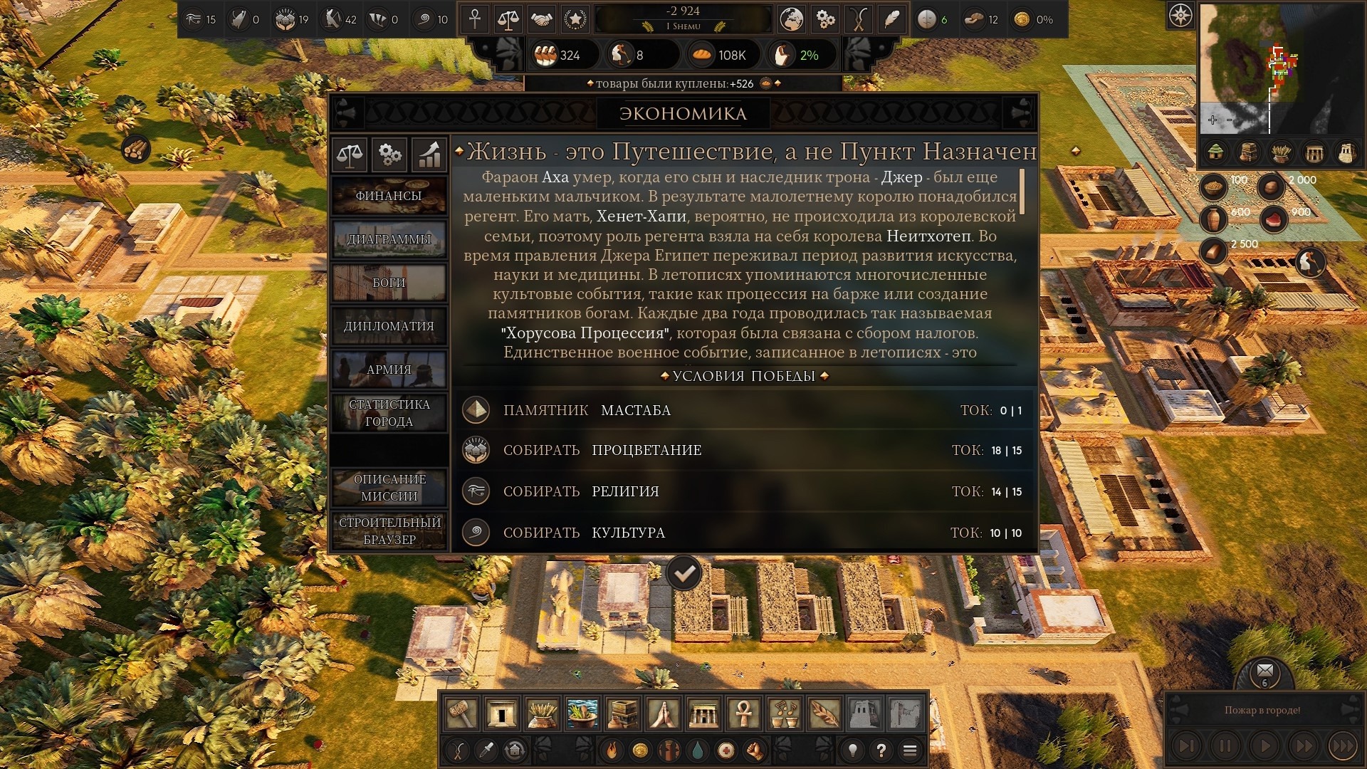 Вы меня простите, но это сюр какой-то с сюжетной кампанией. Задачи миссий обычно заключаются в том, что вы должны довести процветание до определённого уровня, экспортировать что-то куда-то и импортировать что-то себе. Это полбеды – самое главное, что вам обязательно нужно построить какой-то памятник, который будет охраняться ЮНЕСКО через пару тысяч лет.