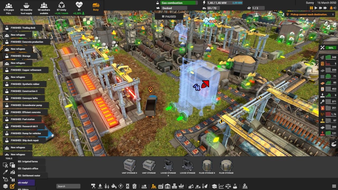 8. Постарайтесь как можно раньше исследовать конвейерные ленты и склады для готовой продукции и сыпучих материалов. Это позволит вам создавать необходимый запас ресурсов, упростит планирование постройки и резко сократит количество поездок и грузовиков.