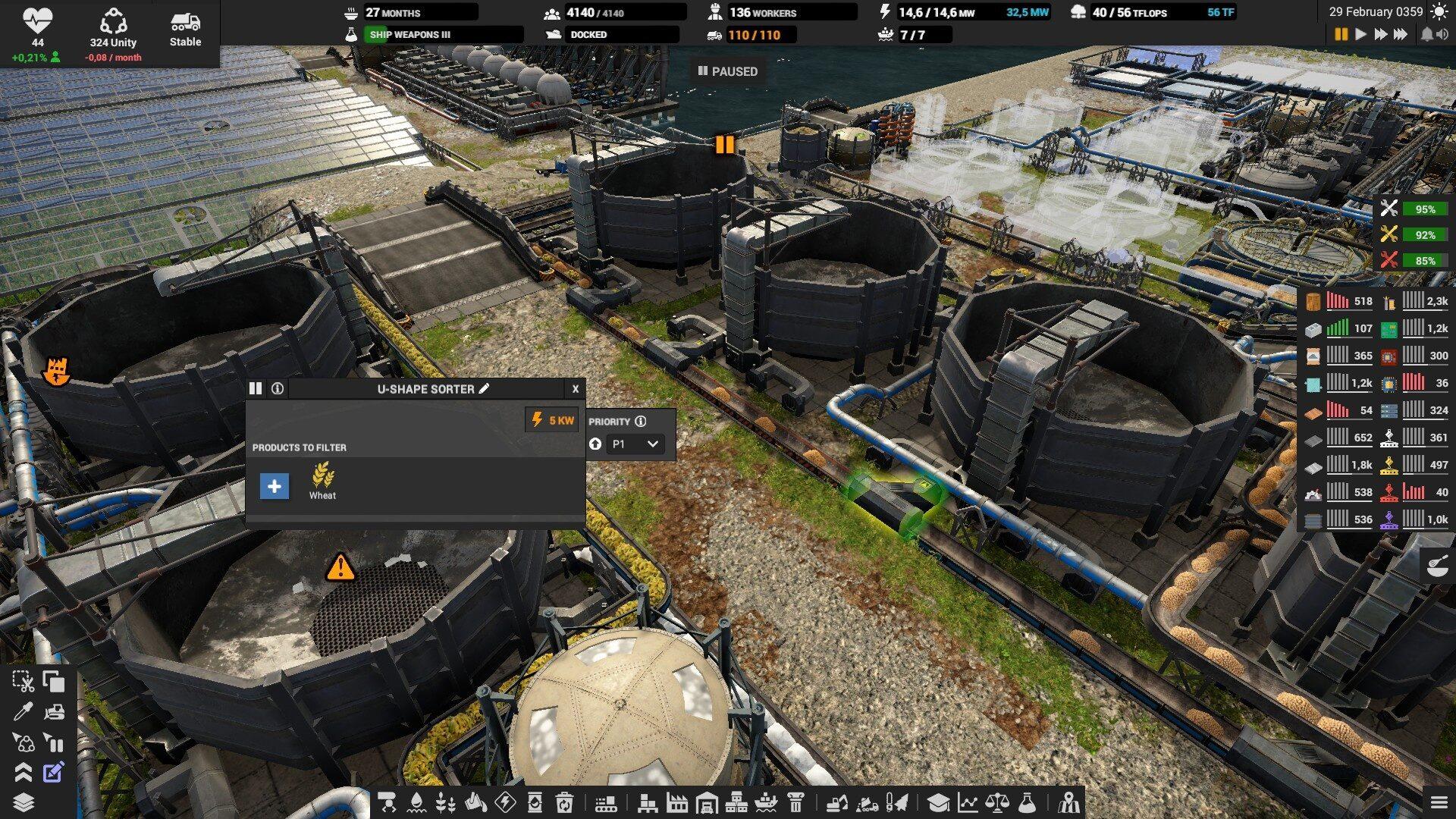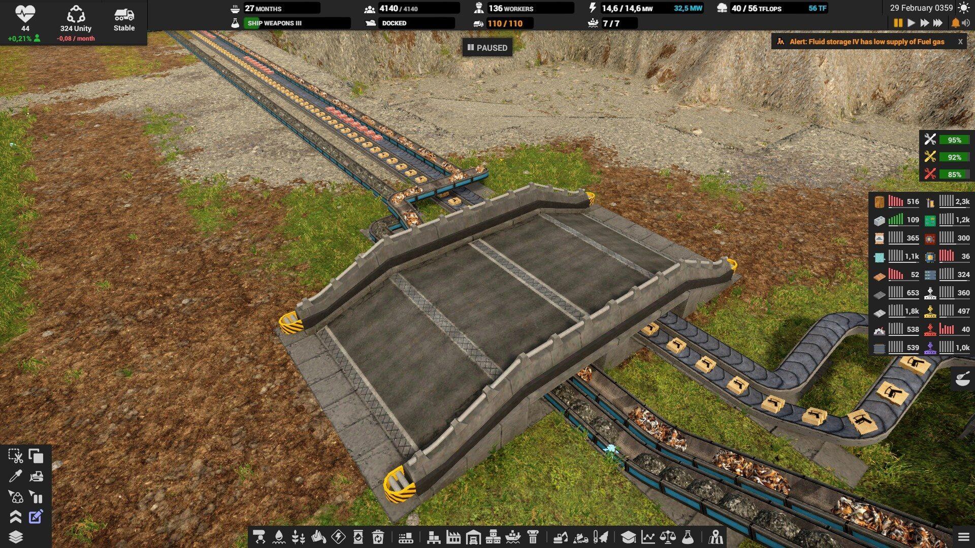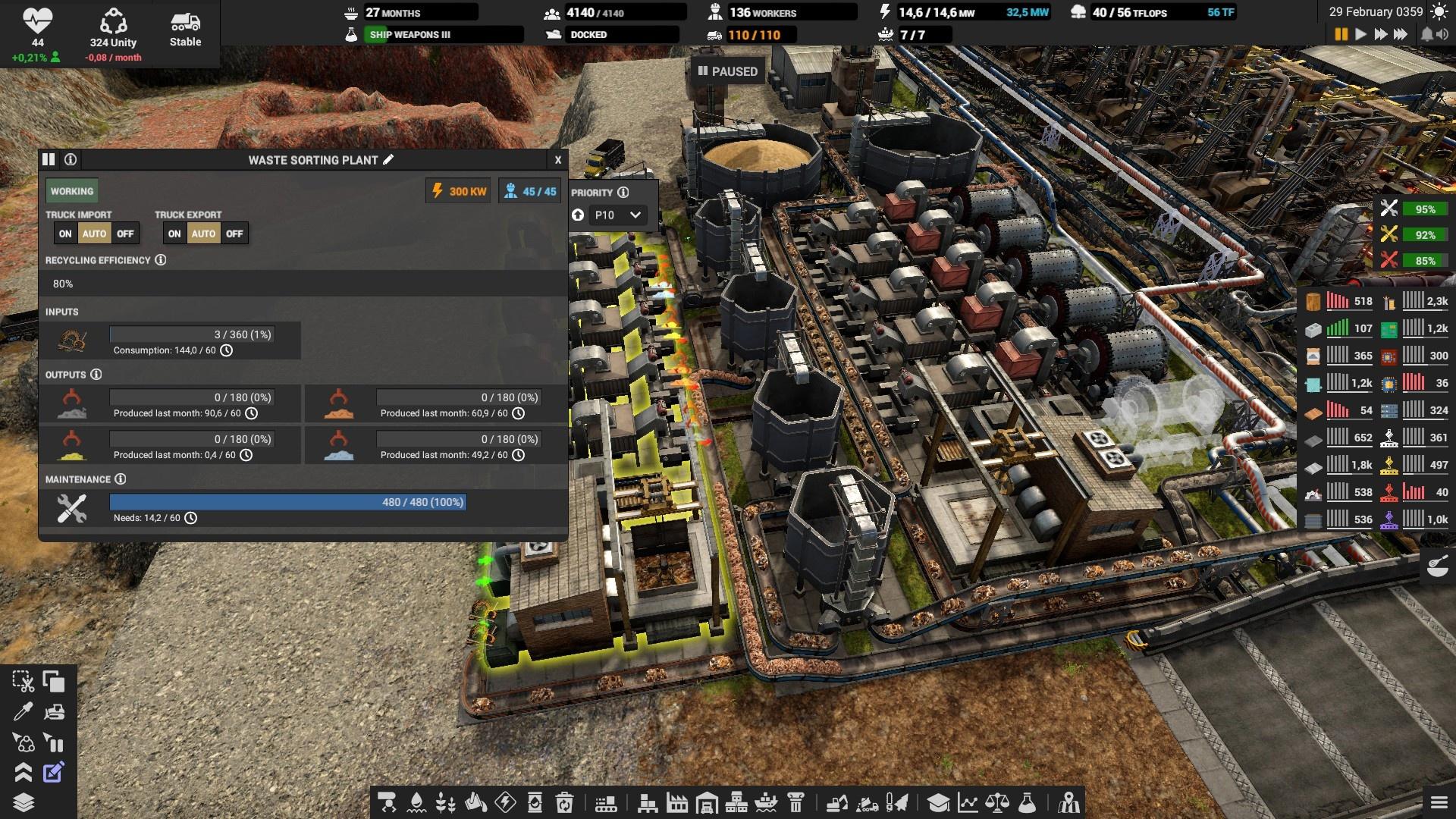 Так как добыча ископаемых не всегда стабильна (лишняя порода, грунт) , что влияет на темпы производства дальше по цепочке, то для промежуточных этапов, где требуется 2 и более комплектующих, желательно строить склад. Это позволит вам продержаться на запасах и не останавливать производство по причине сбоя или задержек.