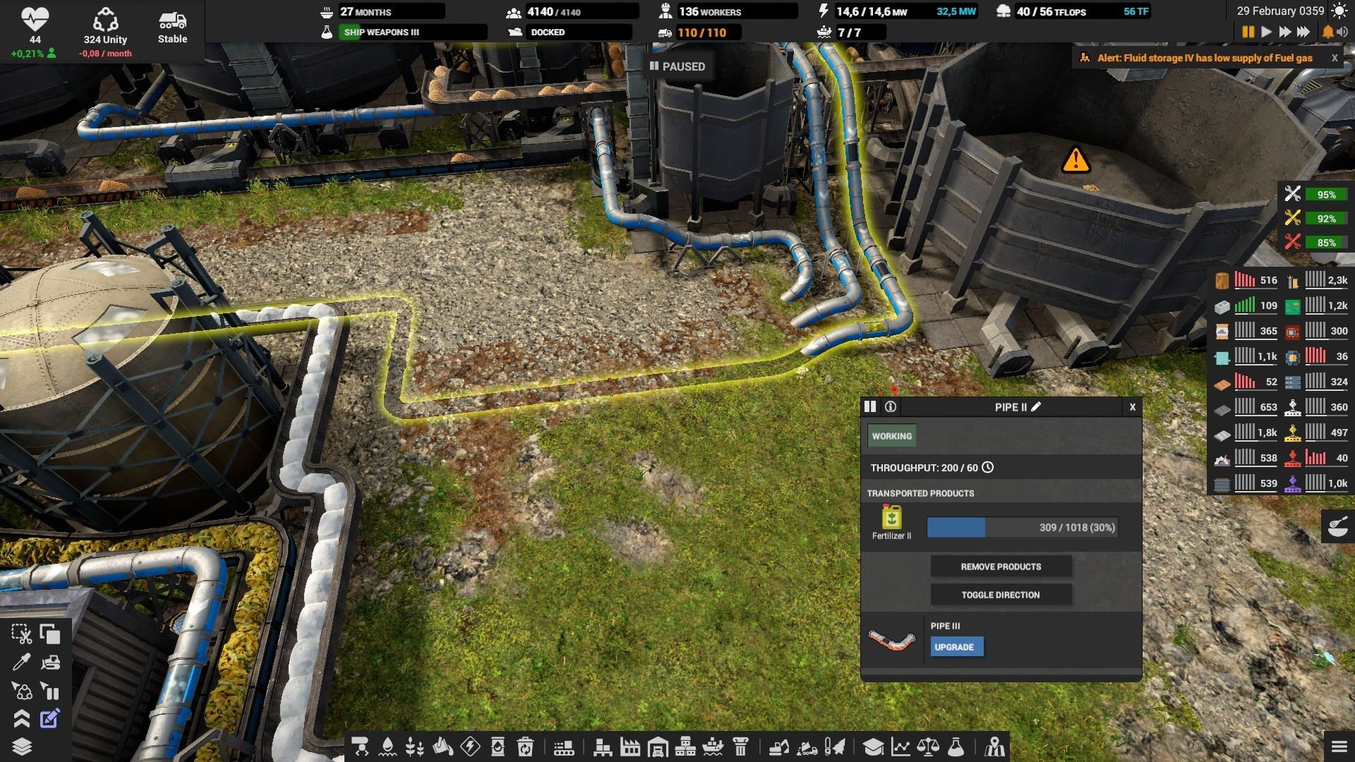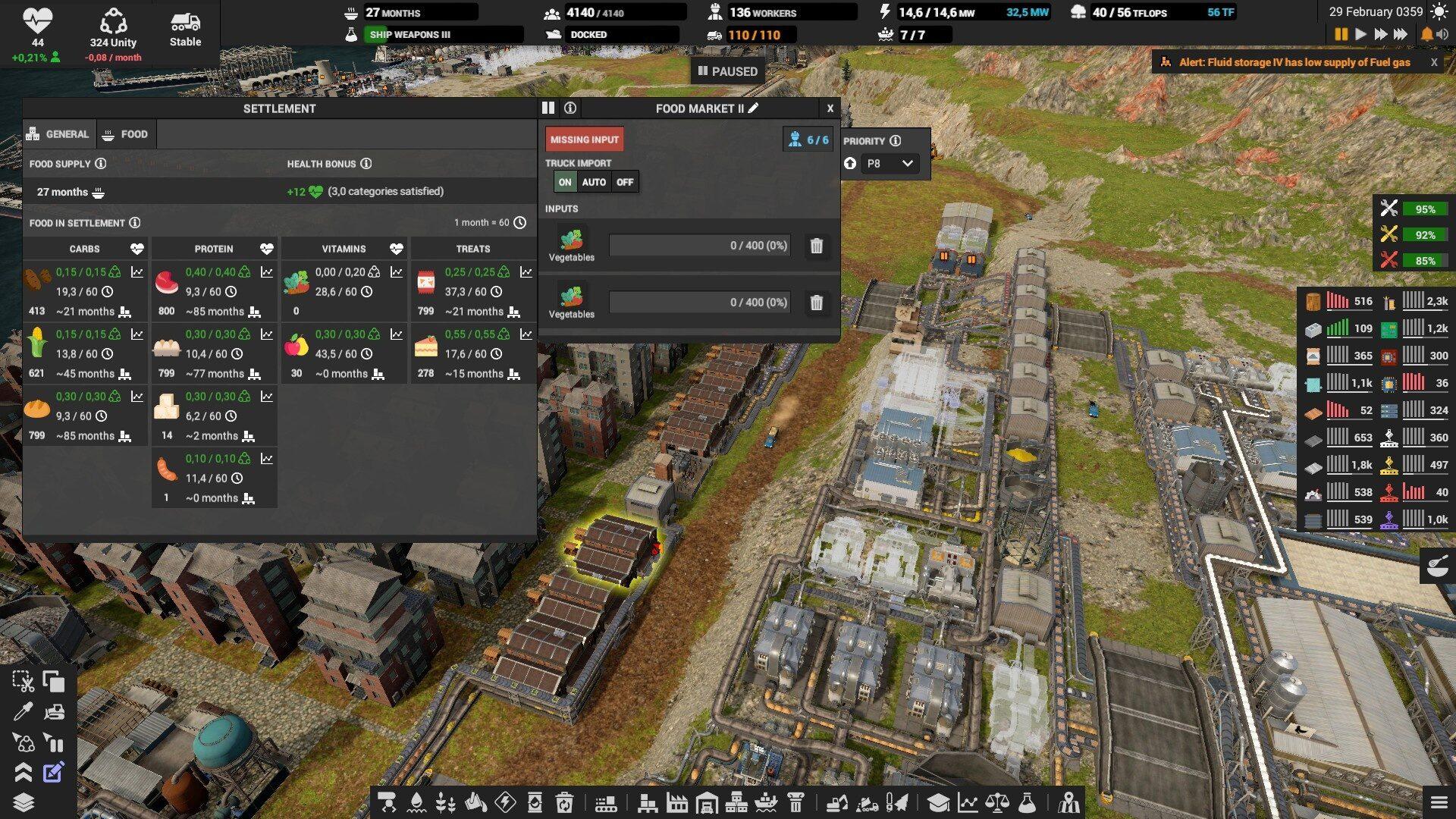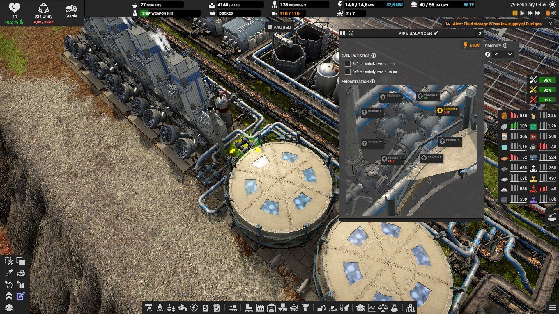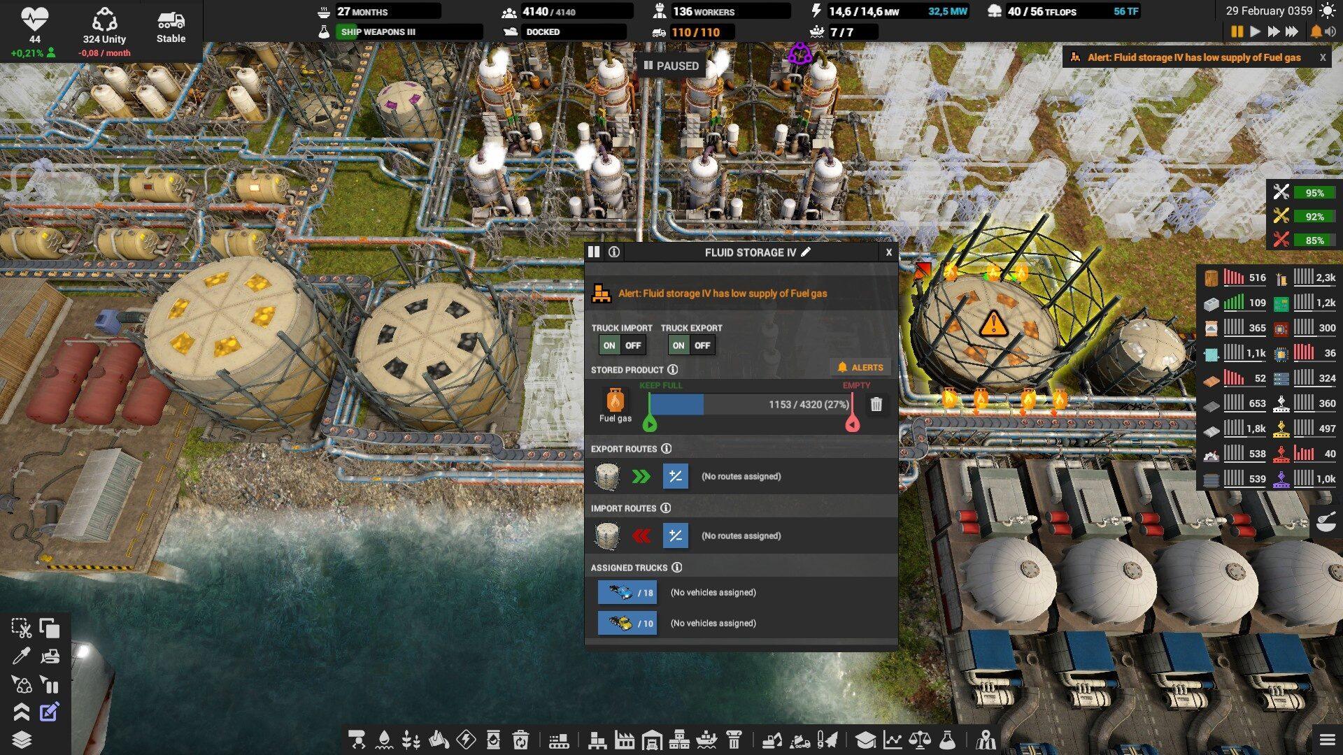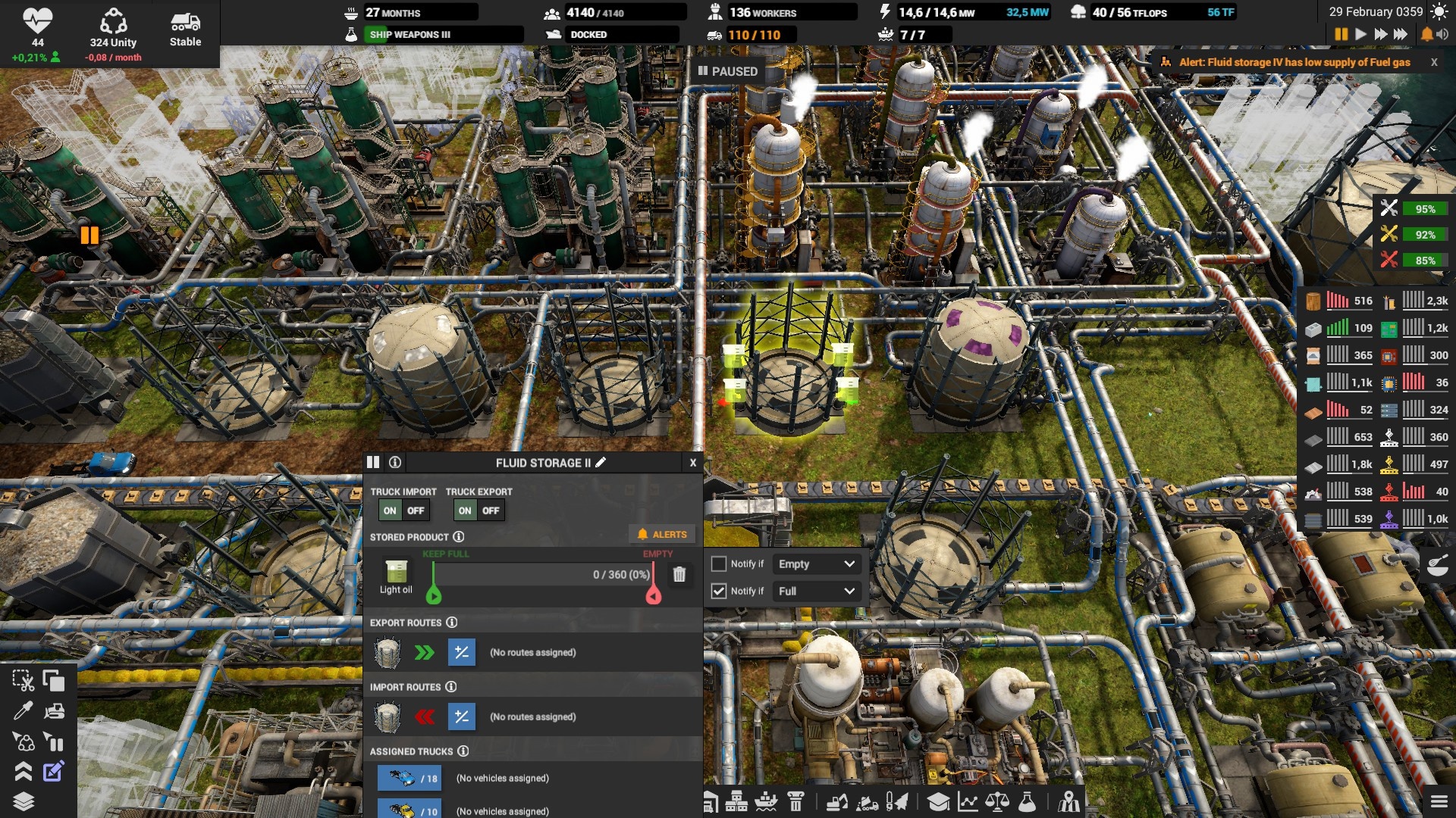 На складах выставляйте оповещение если склад опустеет или переполнится, иначе можно столкнуться с неприятным сюрпризом. Особенно, это надо делать на складе электроники, запчастей, дизеля и всех субпродуктов. Например, если склад с тяжёлой нефтью полон, то и среднюю перестанут производить, а это значит, что не будет и дизеля. Склады с вывозимыми отходами вроде шлака, желательно ставить на автоматическое опустошение.