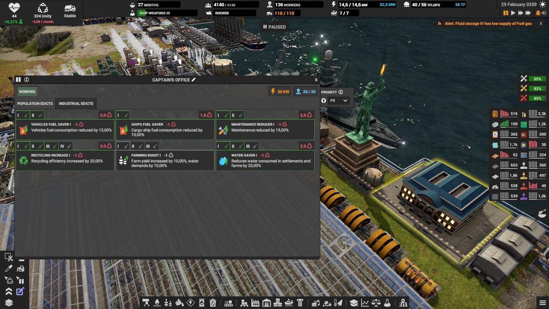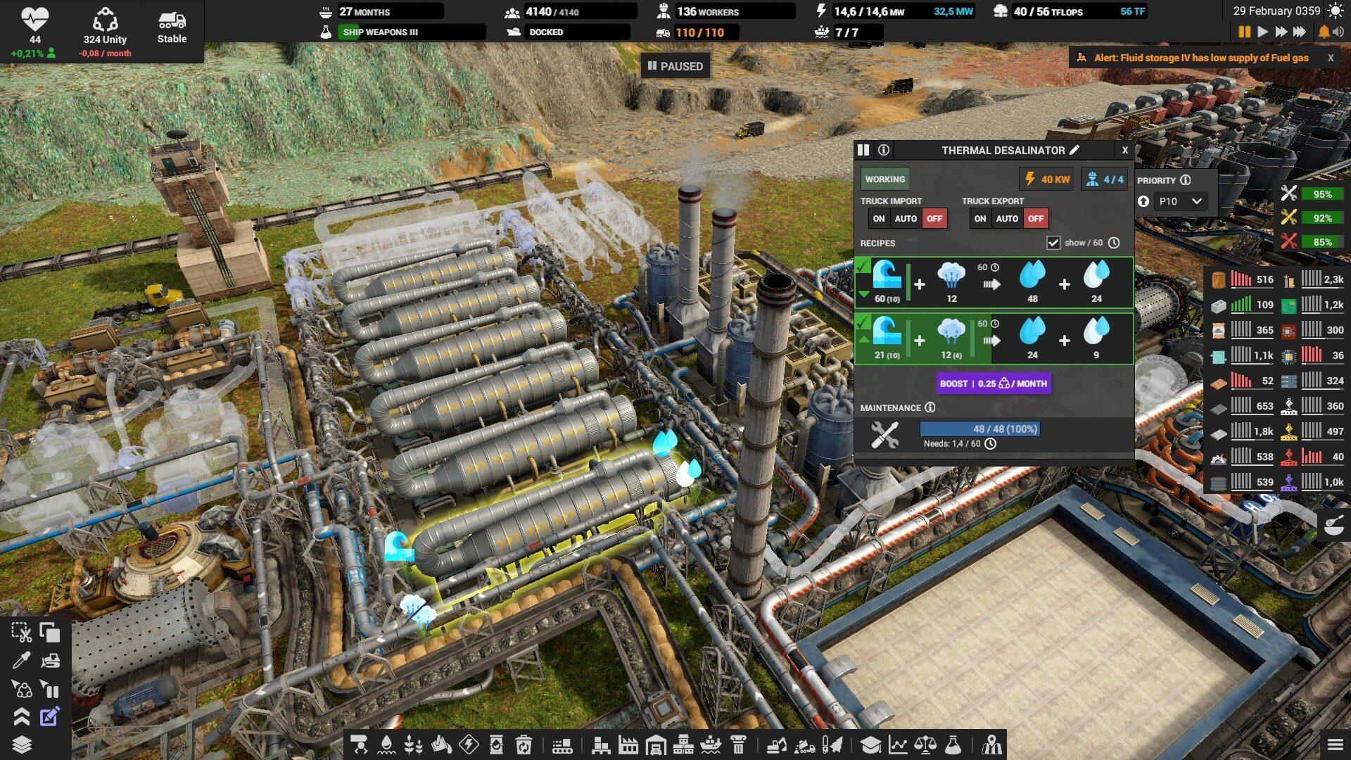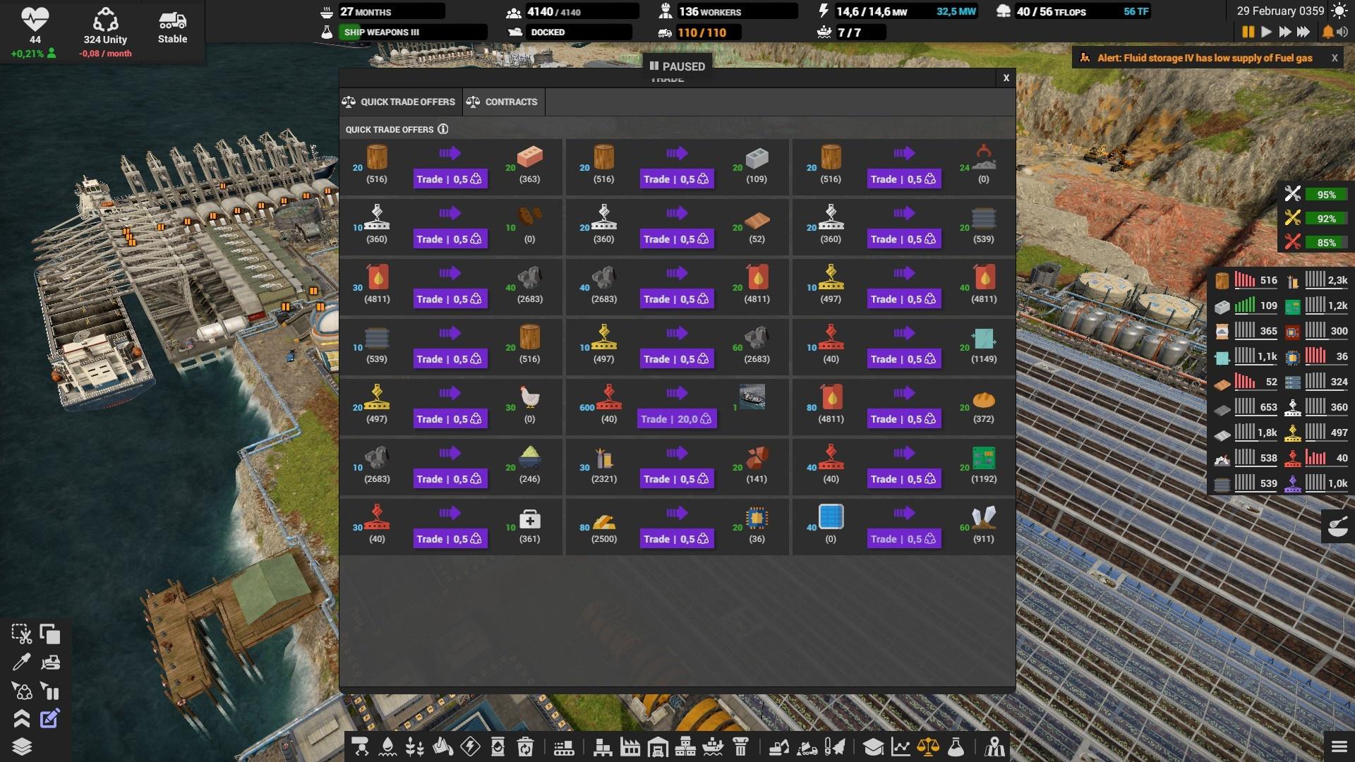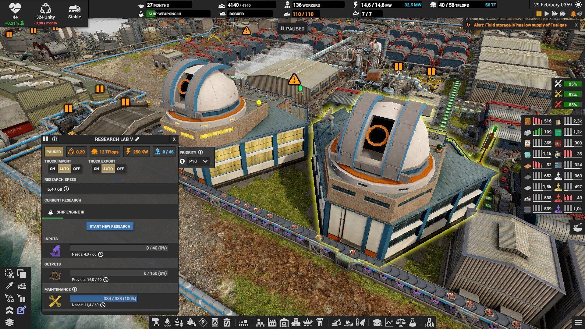 На складах выставляйте оповещение если склад опустеет или переполнится, иначе можно столкнуться с неприятным сюрпризом. Особенно, это надо делать на складе электроники, запчастей, дизеля и всех субпродуктов. Например, если склад с тяжёлой нефтью полон, то и среднюю перестанут производить, а это значит, что не будет и дизеля. Склады с вывозимыми отходами вроде шлака, желательно ставить на автоматическое опустошение.