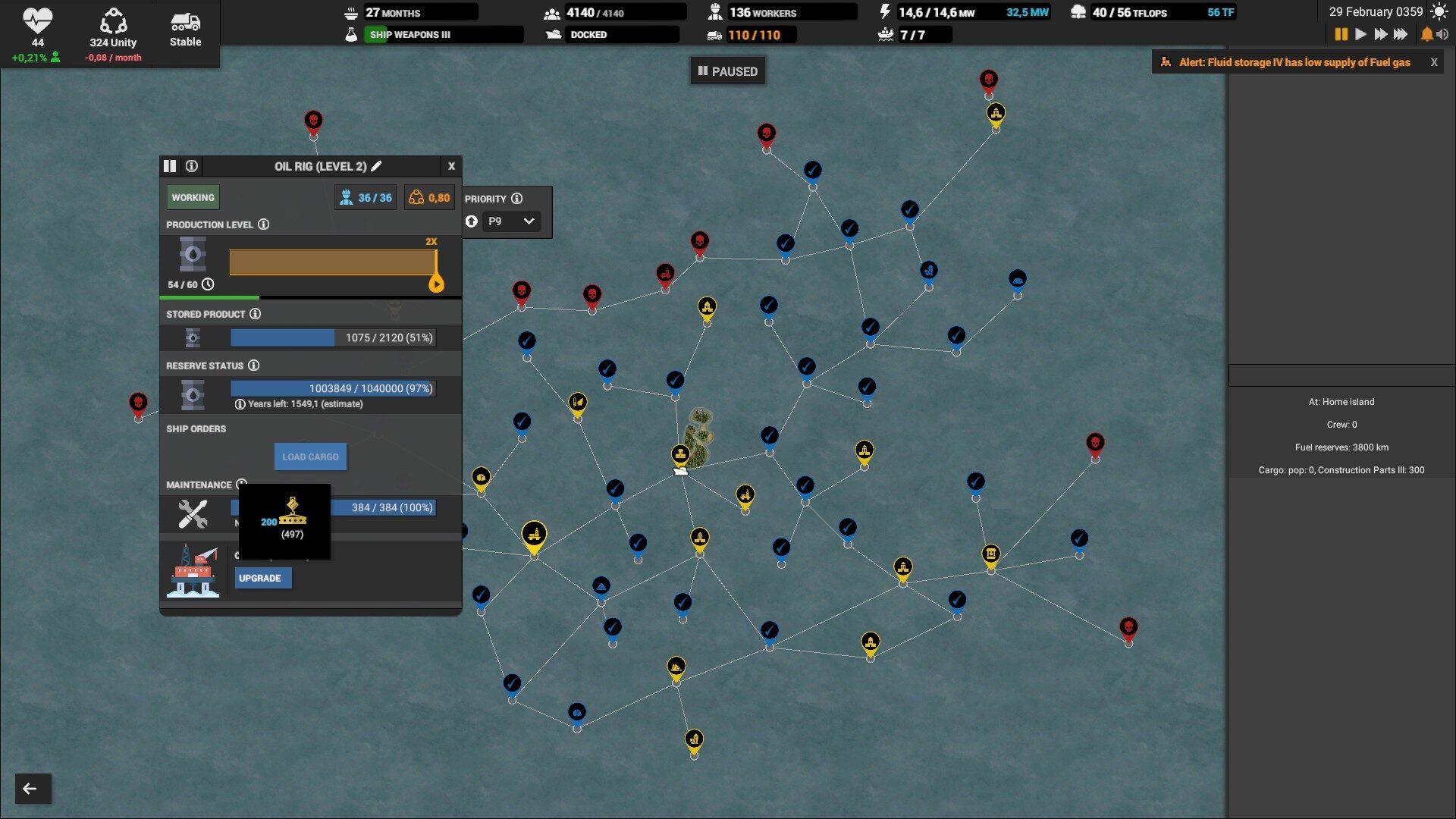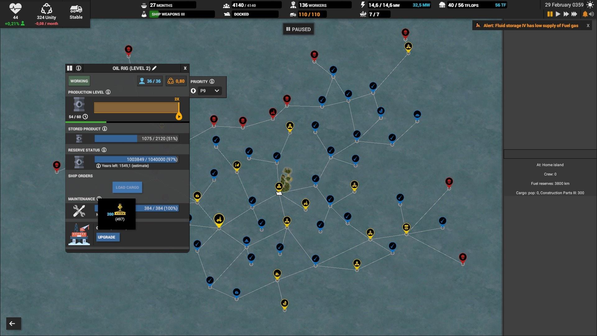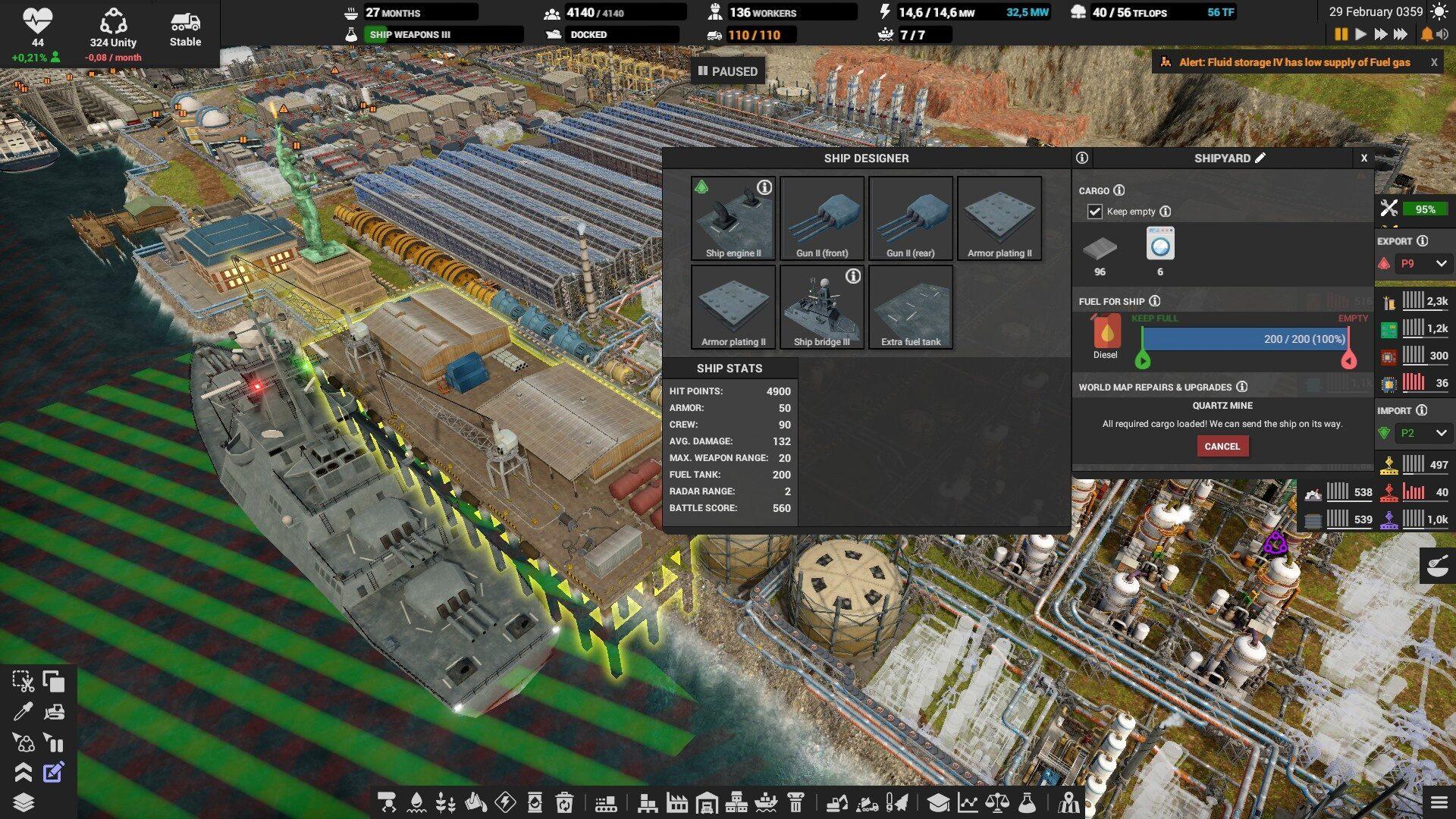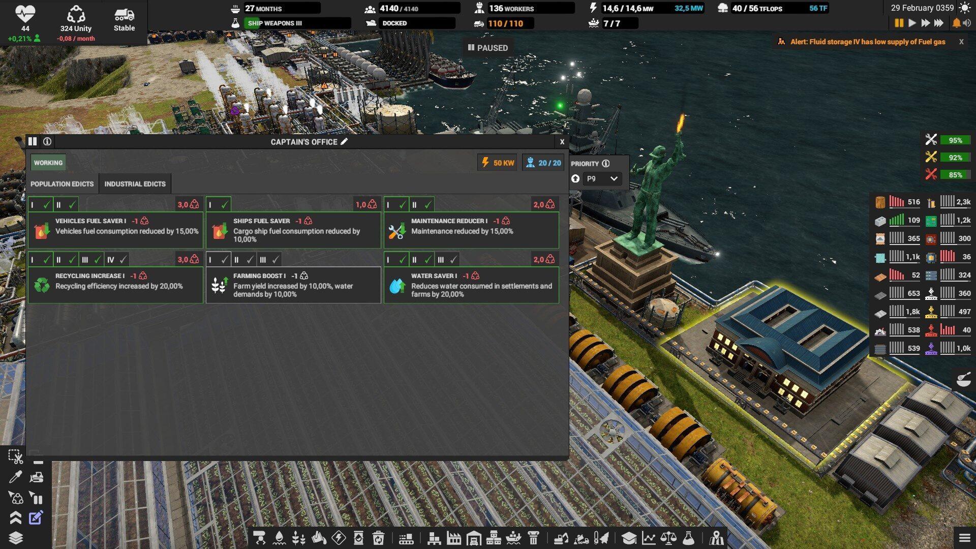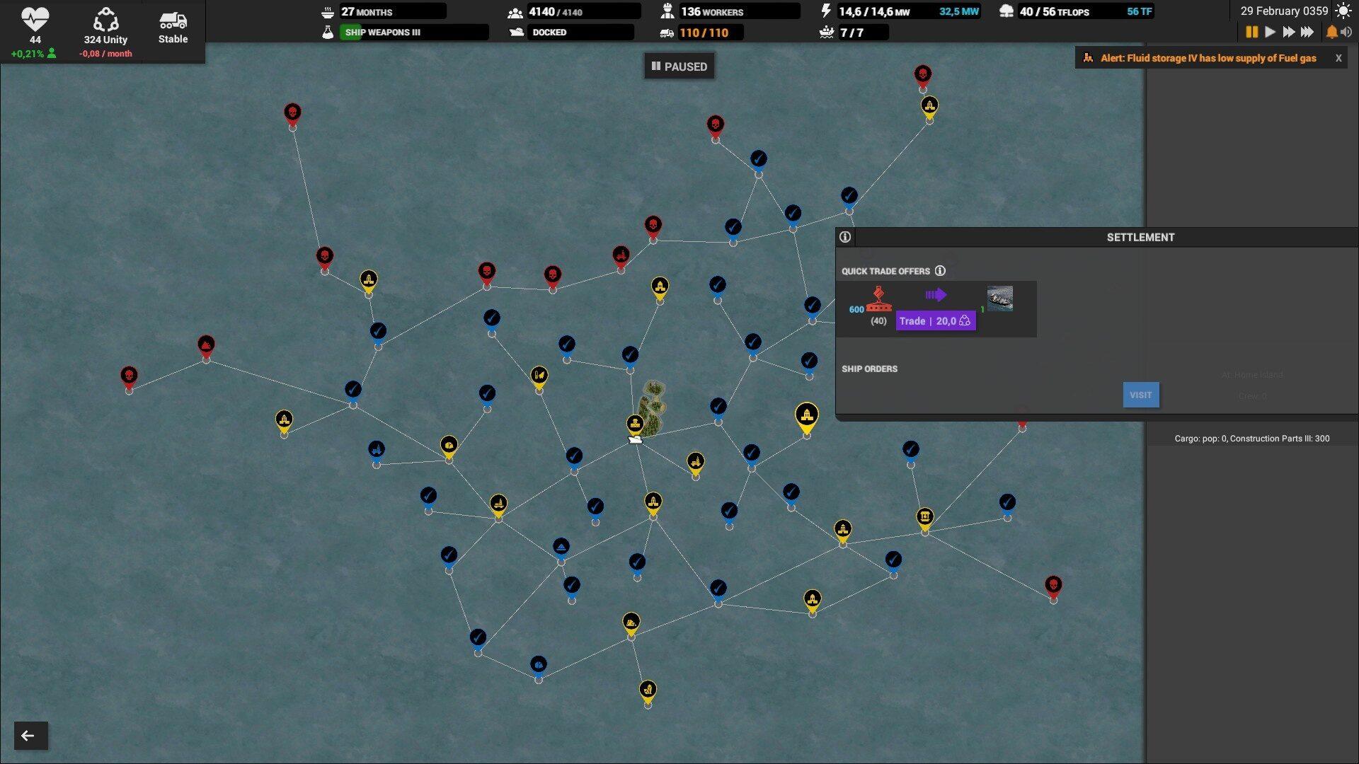 На складах выставляйте оповещение если склад опустеет или переполнится, иначе можно столкнуться с неприятным сюрпризом. Особенно, это надо делать на складе электроники, запчастей, дизеля и всех субпродуктов. Например, если склад с тяжёлой нефтью полон, то и среднюю перестанут производить, а это значит, что не будет и дизеля. Склады с вывозимыми отходами вроде шлака, желательно ставить на автоматическое опустошение.