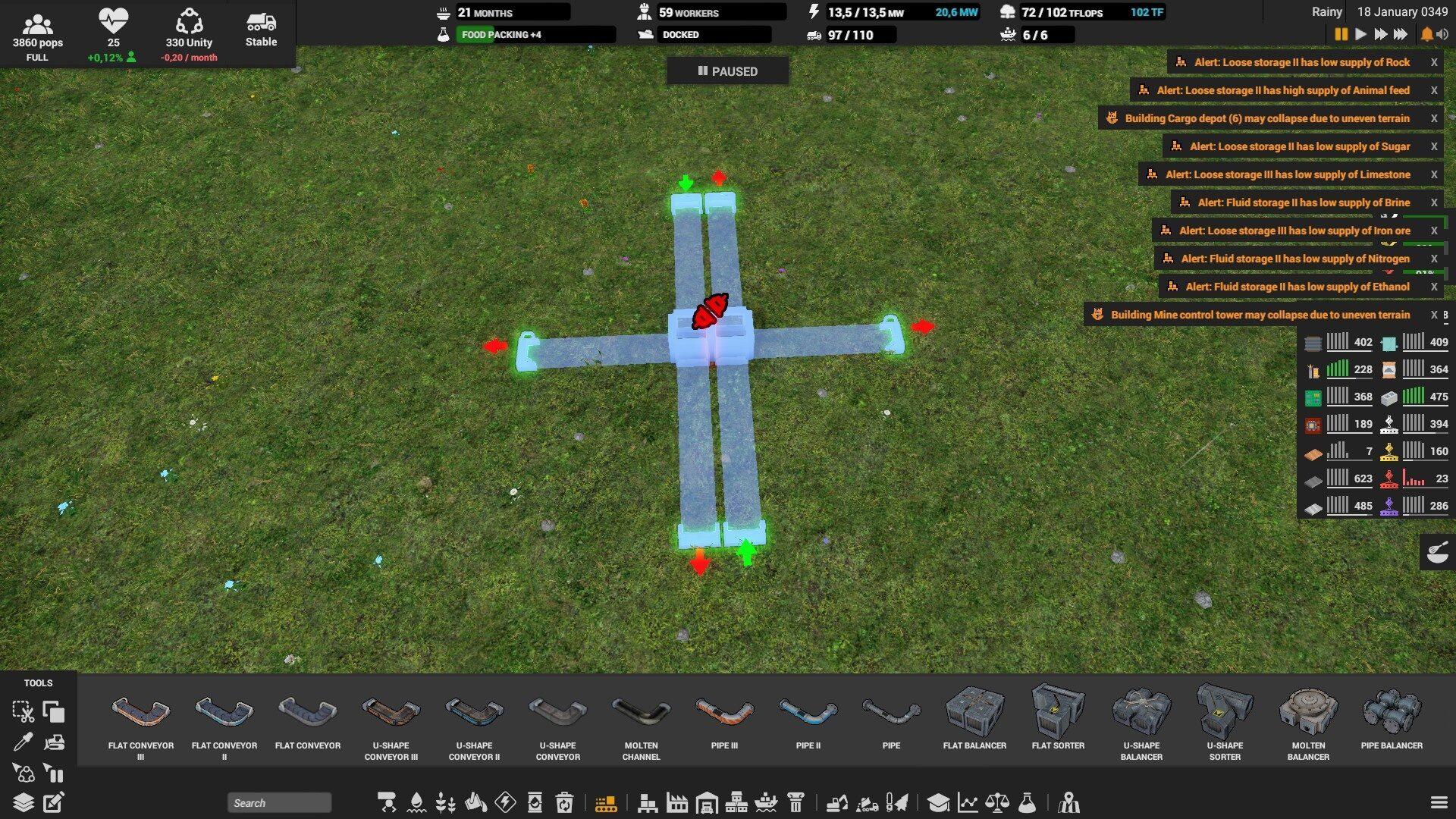 Маленький лайфхак: бывает ситуация, когда не получается провести трубу на месте по причине различных ограничений (нельзя поставить рядом 2 коннектора), но если спланировать трубу на пустой клетке, вырезать её и поставить на нужное место, то это сработает. Таким же образом, можно ставить производства вплотную если заранее сделать коннектор.