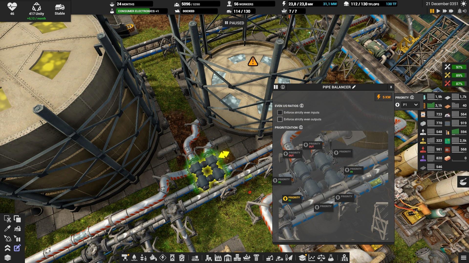 ВСЕГДА создавайте возможность экстренного сброса (использования) побочных продуктов! Например, разделитель воздуха производит азот и кислород. 100% сбалансировать их потребление не всегда возможно, а если заполнится хранилище азота, то и кислород перестанет производиться, пока не будет использован азот. Потому, надо поставить трубу для выброса излишка в атмосферу и перед ней приоритезатор.